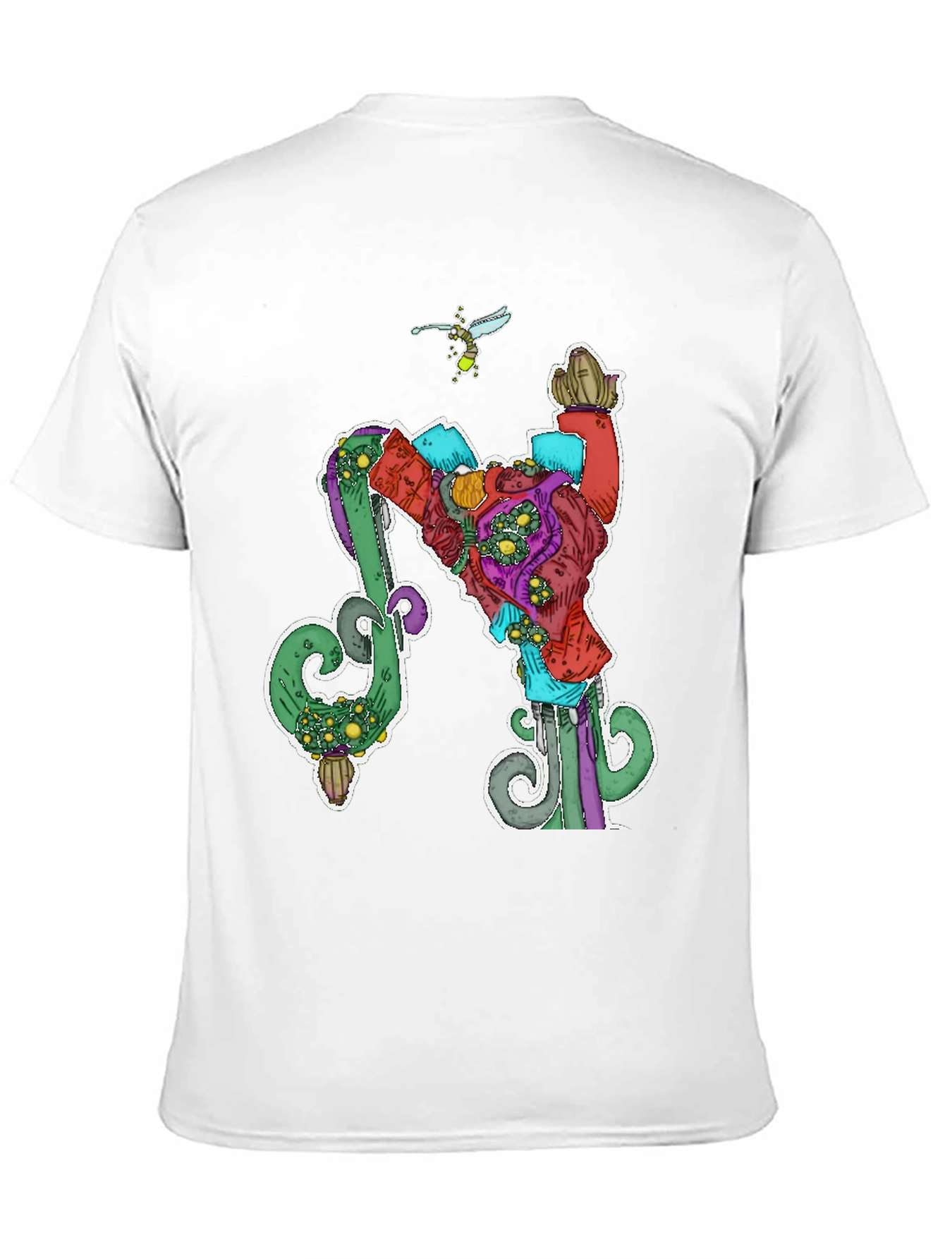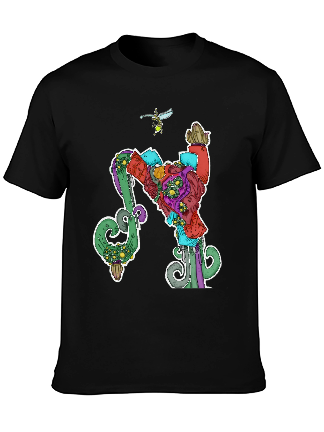 Unleash your quirky style with this unique black t-shirt featuring a vibrant, abstract cactus creature design. This eye-catching graphic blends vivid greens, reds, purples, and blues in a surreal botanical-inspired form, accented with cartoon-like details. A small bee buzzing above adds a playful touch. The comfortable tee is perfect for casual wear, making a bold statement wherever you go. Express your individuality and add a touch of whimsical art to your wardrobe with this standout piece.