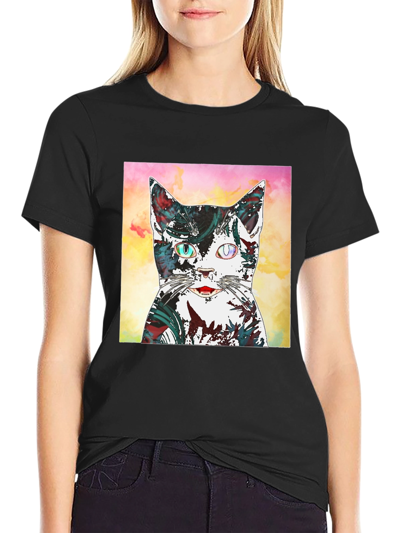 Express your unique style with this eye-catching black t-shirt featuring an abstract cat graphic. The vibrant and colorful design, set against a soft pastel backdrop, adds a pop of personality to any outfit. Made from comfortable, breathable fabric, this tee is perfect for everyday wear. The bold cat print makes a statement, showcasing your love for animals and art. Pair it with jeans for a casual look or dress it up with a blazer for a trendy ensemble. Ideal for cat lovers and art enthusiasts alike, this t-shirt is sure to turn heads.