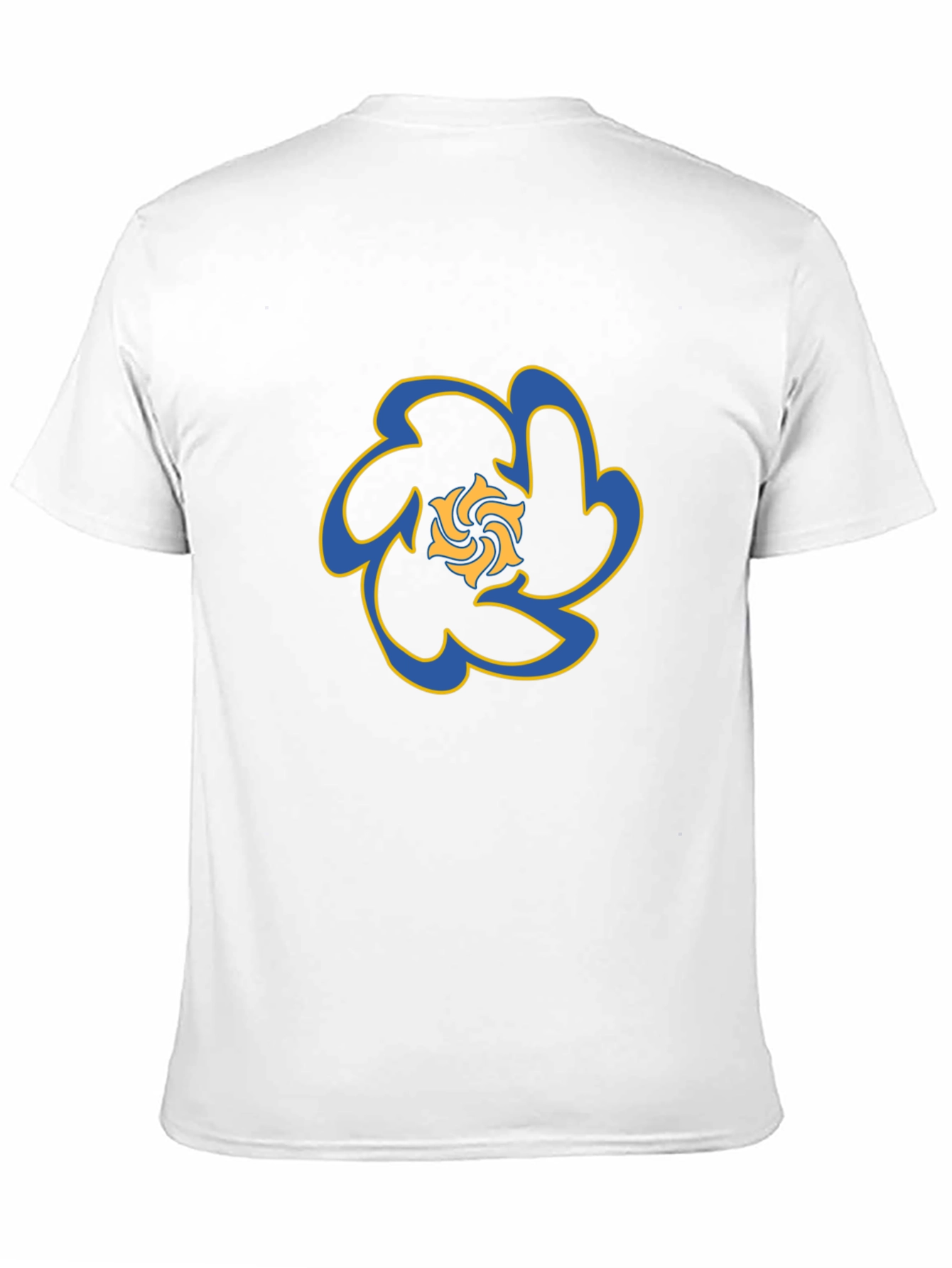Make a statement with this eye-catching black t-shirt featuring a unique abstract floral design. The design showcases a central gold swirling element surrounded by a bold blue outline, creating a vibrant contrast against the black fabric. Made from a comfortable, breathable material, this tee is perfect for everyday wear. Dress it up with jeans for a casual outing, or wear it around the house for a relaxed style. Stand out from the crowd with this unique and stylish t-shirt. A must-have for any fashion-forward wardrobe.
