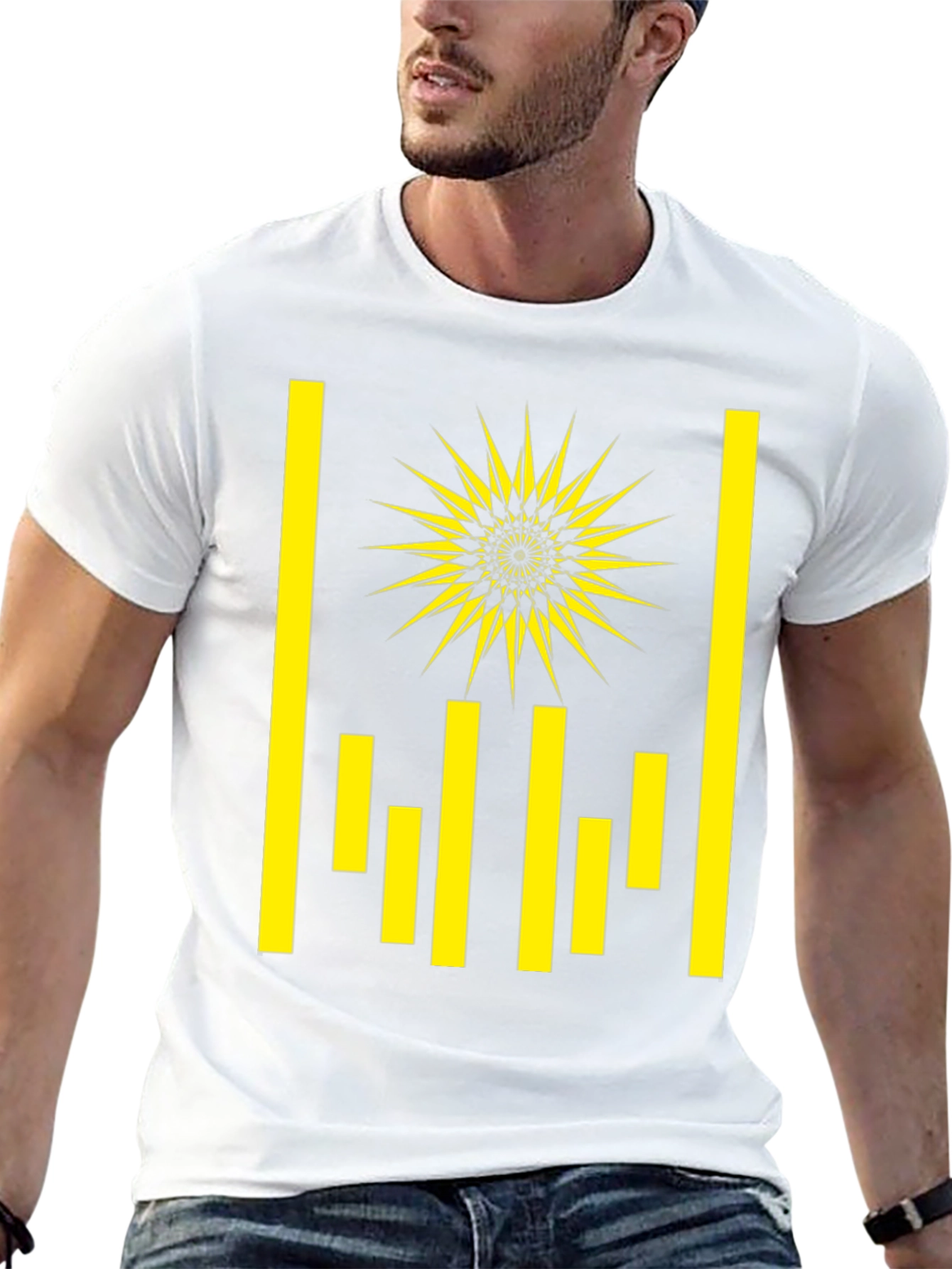 This striking black t-shirt features a bold yellow geometric design, creating a modern and eye-catching look. The graphic incorporates a sun-like burst pattern at the top, complemented by vertical lines and bar shapes. Made from a soft-looking material, this tee appears to be comfortable and durable, ideal for everyday wear. Perfect for casual outings, concerts, or making a statement, this tee combines artistic expression with effortless style. Elevate your wardrobe with this unique and fashionable piece.