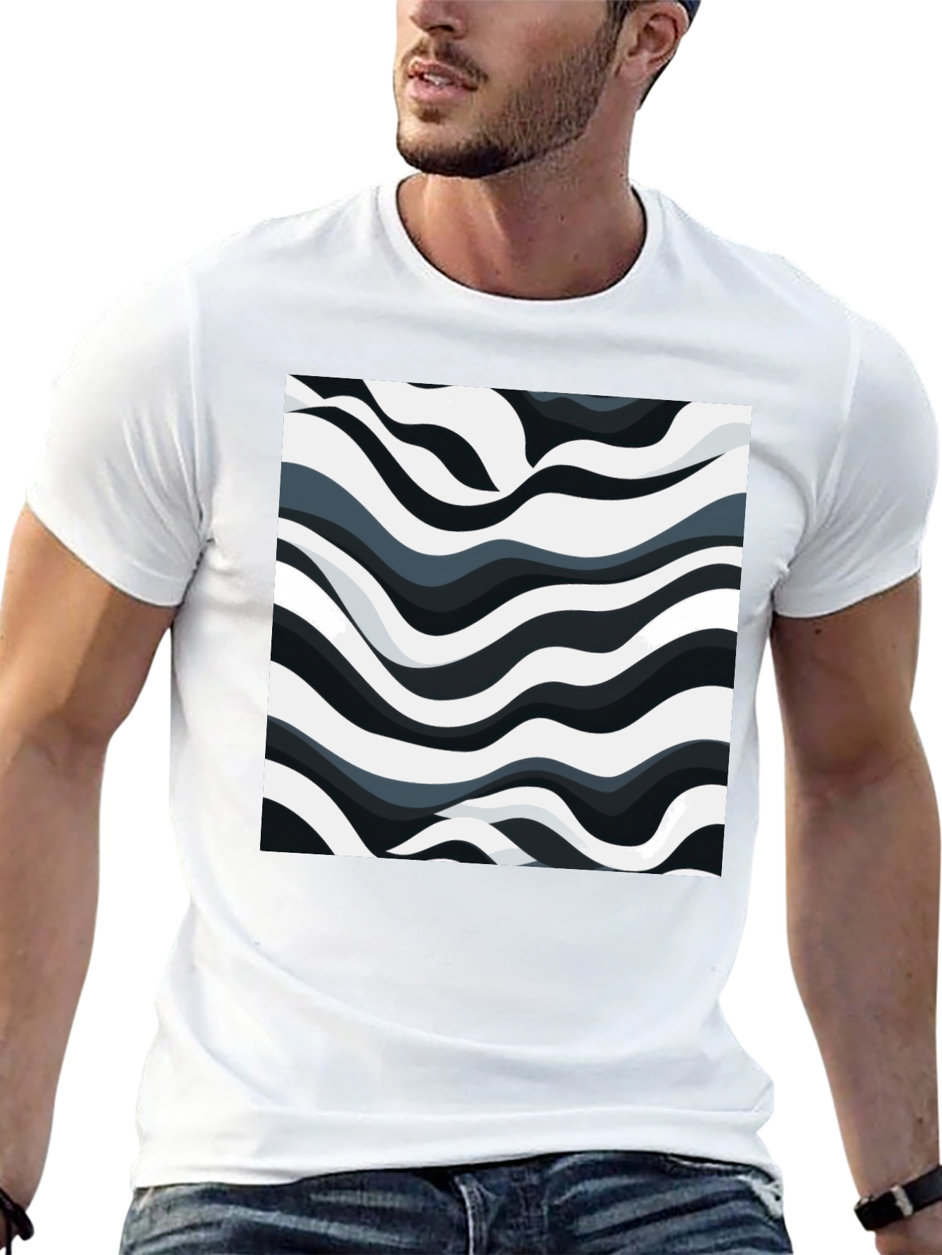 Make a statement with this striking black t-shirt featuring a bold, abstract wave pattern. The design showcases undulating stripes of white, grey, and black, creating a visually appealing, modern aesthetic. Crafted from comfortable, breathable fabric, this tee offers a relaxed fit, perfect for everyday wear. Pair it with jeans for a casual look or dress it up with chinos for a more polished ensemble. Ideal for those who appreciate contemporary art and unique designs, this t-shirt is a must-have addition to your wardrobe. Stand out from the crowd and express your individuality with this eye-catching piece!