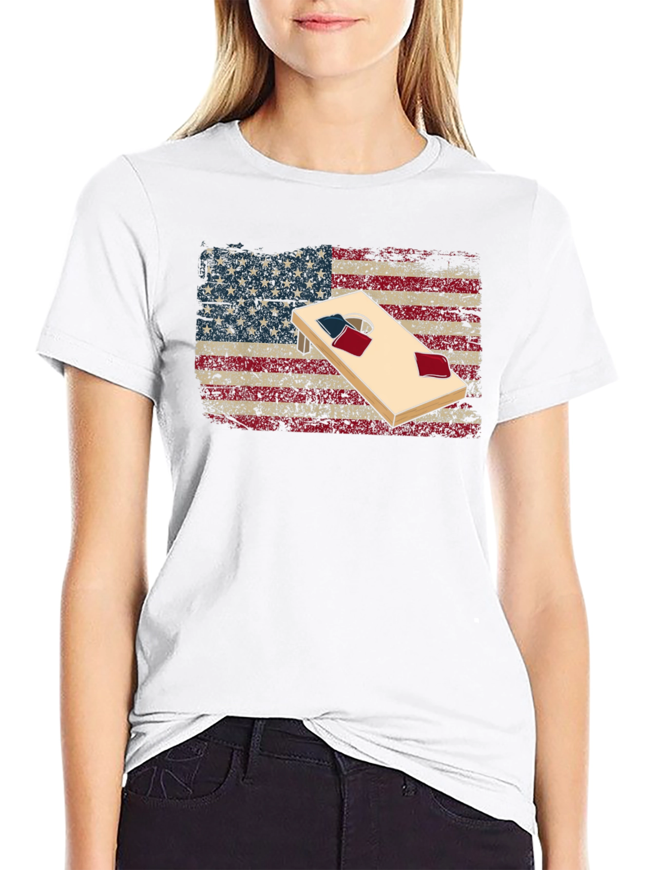 Show your love for America and cornhole with this unique t-shirt! The design features a distressed American flag backdrop with a cornhole board graphic. Two bean bags are on the board, ready for a competitive game. The black tee provides a striking contrast to the vibrant flag colors. Made from soft, breathable fabric, this shirt is comfortable to wear all day long. Ideal for backyard BBQs, tailgating, or casual everyday wear. Let everyone know you're ready for a cornhole challenge with this fun and patriotic tee.