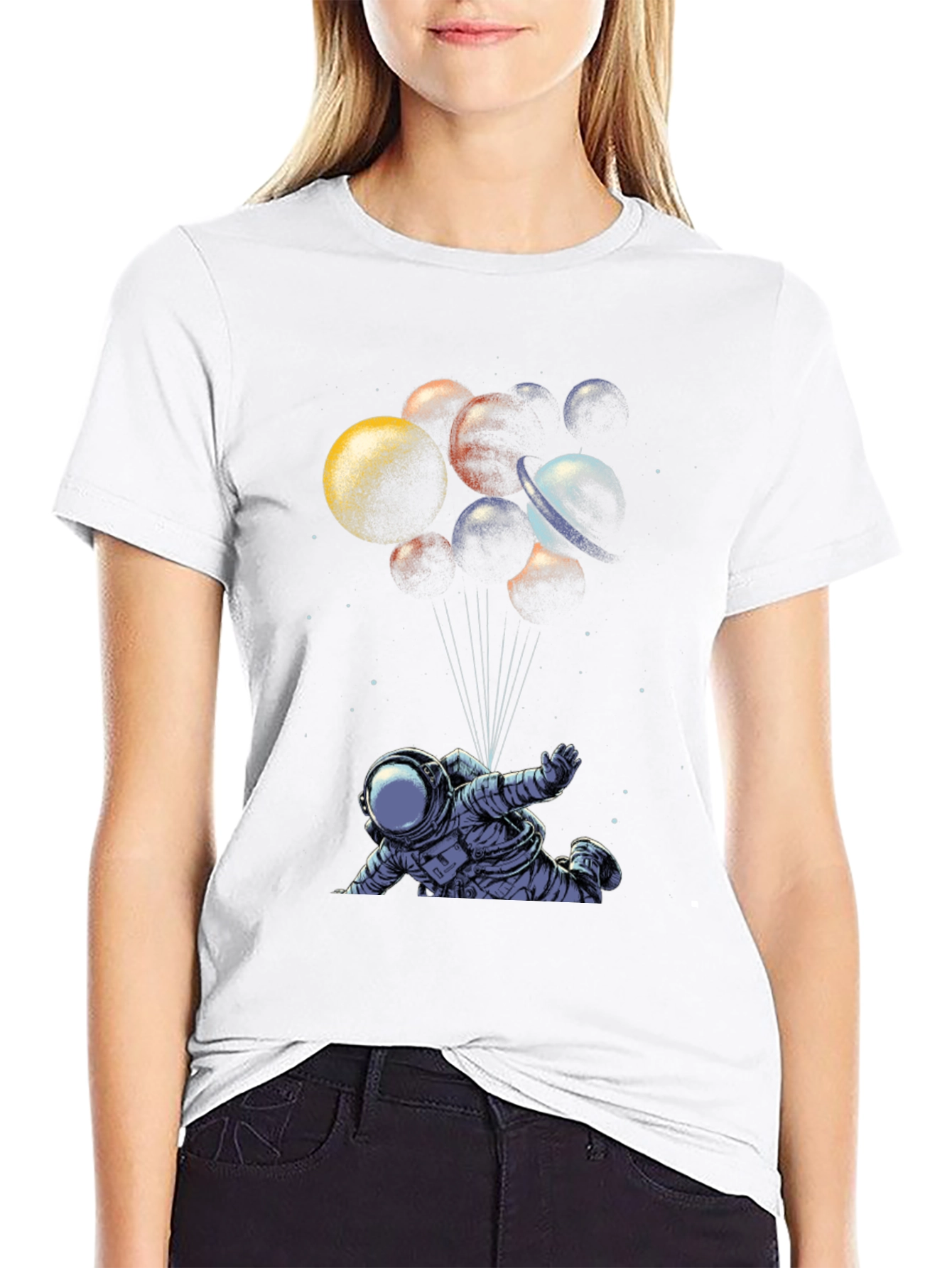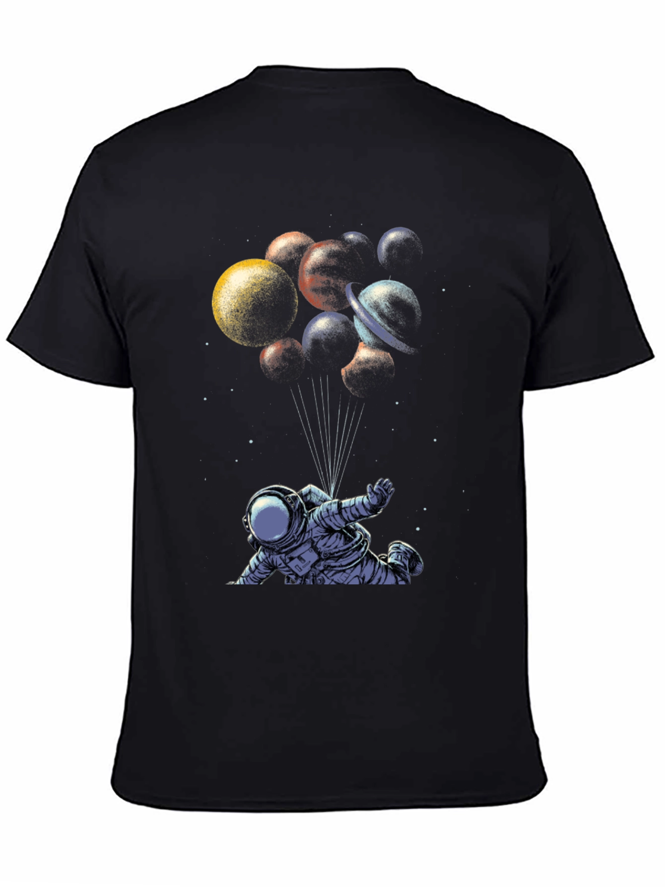 Embark on an intergalactic adventure with this captivating graphic tee. Showcasing a unique design, it features an astronaut playfully floating among vibrant planet balloons against a dark, starry background. This eye-catching image is printed on a soft, breathable black fabric, ensuring all-day comfort and style. Perfect for space enthusiasts, dreamers, or anyone looking to add a touch of whimsy to their wardrobe. Pair it with jeans for a casual look, or dress it up with a blazer for a bolder statement. Let your imagination take flight with this one-of-a-kind tee.