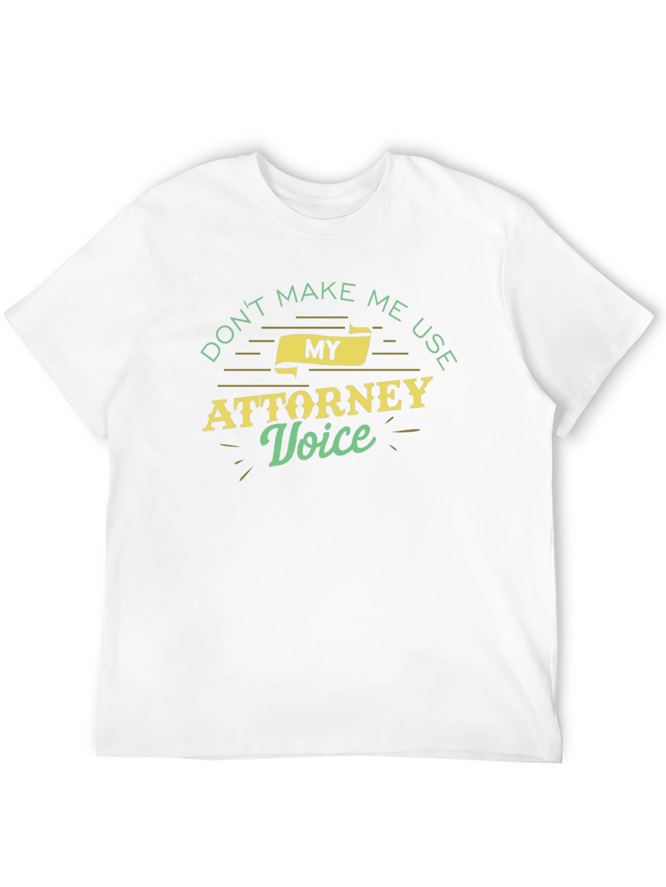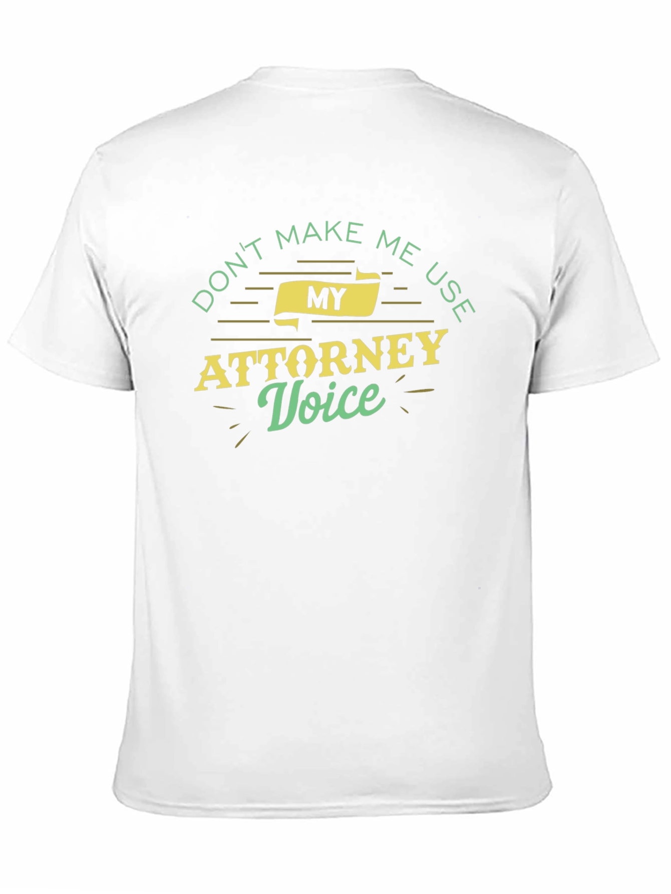 Make a statement with this bold black tee! The shirt features a quirky graphic print that reads, "Don't Make Me Use My Attorney Voice." The text is rendered in a mix of yellow and green hues, giving it a vibrant and eye-catching look. This playful top is perfect for lawyers, law students, or anyone with a sharp wit. Made from comfortable, breathable fabric, it's ideal for casual wear, law school events, or even a day in court. Show off your legal prowess with this fun and unique t-shirt!