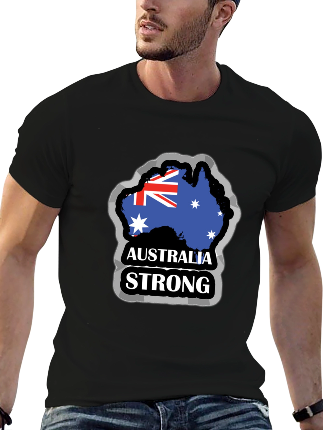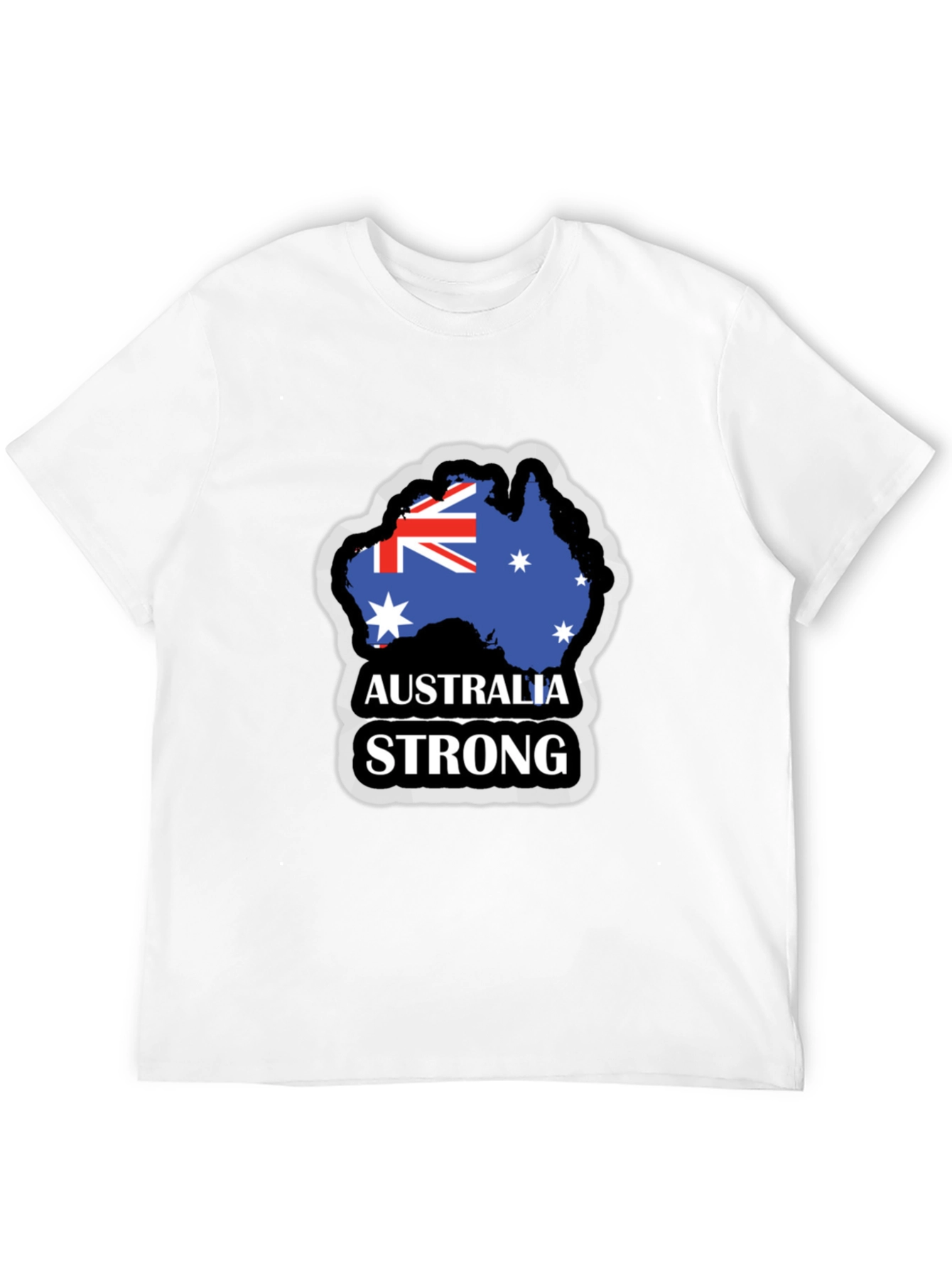 Show your Australian pride with this stylish men's black t-shirt. The shirt features a bold graphic of the Australian flag in the shape of the country, with 'Australia Strong' printed underneath. The design is accented with a gray border, adding a touch of rugged appeal. Made from comfortable, breathable material, this tee is perfect for everyday wear, sporting events, or casual outings. Let your love for Australia shine with this eye-catching and unique t-shirt. This T-shirt is a great way to celebrate Australia Day or to show your support for Australian athletes and teams.