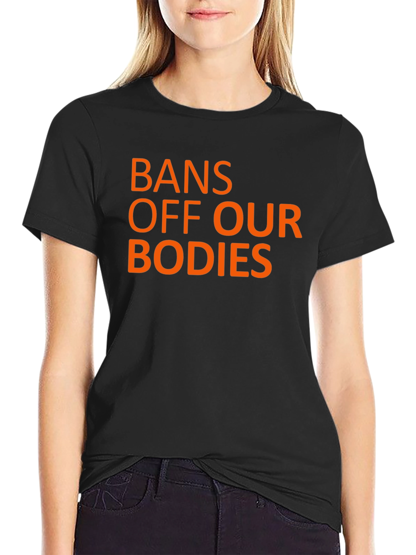 Make a statement with this bold black tee. Featuring the message 'Bans Off Our Bodies' in vibrant orange text, this shirt is a powerful expression of solidarity. Constructed from a soft, comfortable material, this tee is perfect for everyday wear and activism. The classic cut makes it an easy fit for everyone. Wear it to rallies, protests, or just out and about to show your support for reproductive rights. Let your clothing speak volumes and make a difference with this impactful graphic tee.
