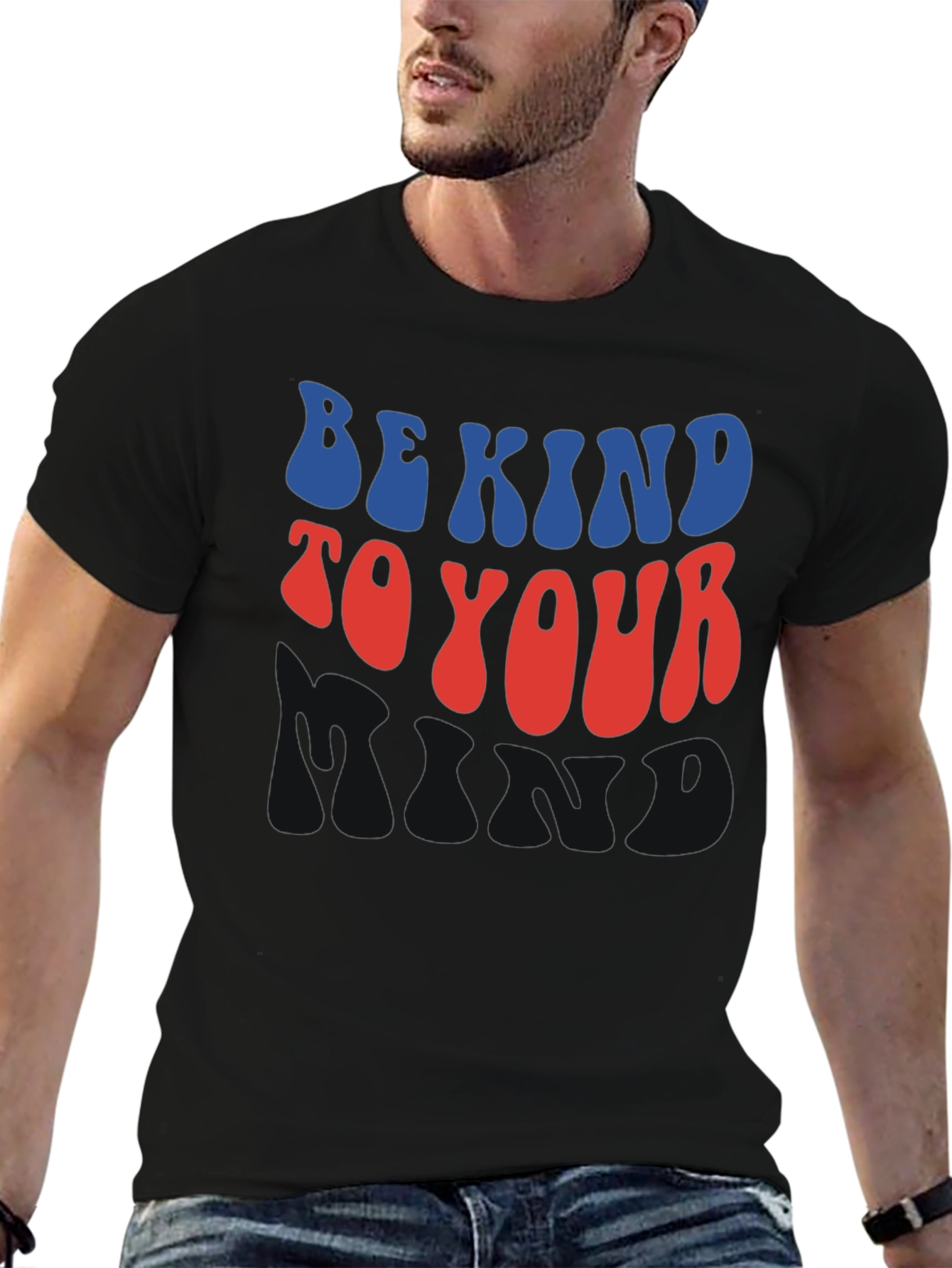 This black t-shirt features a retro-inspired graphic design with the phrase "Be Kind to Your Mind" in a playful, wavy font. The words are stacked in blue, red, and black. Made from comfortable cotton, this short-sleeved tee is perfect for everyday wear. Show off your style while spreading a positive message. Great for casual outings, lounging, or as a conversation starter. Its classic fit makes it a versatile addition to any wardrobe. A stylish and meaningful choice!