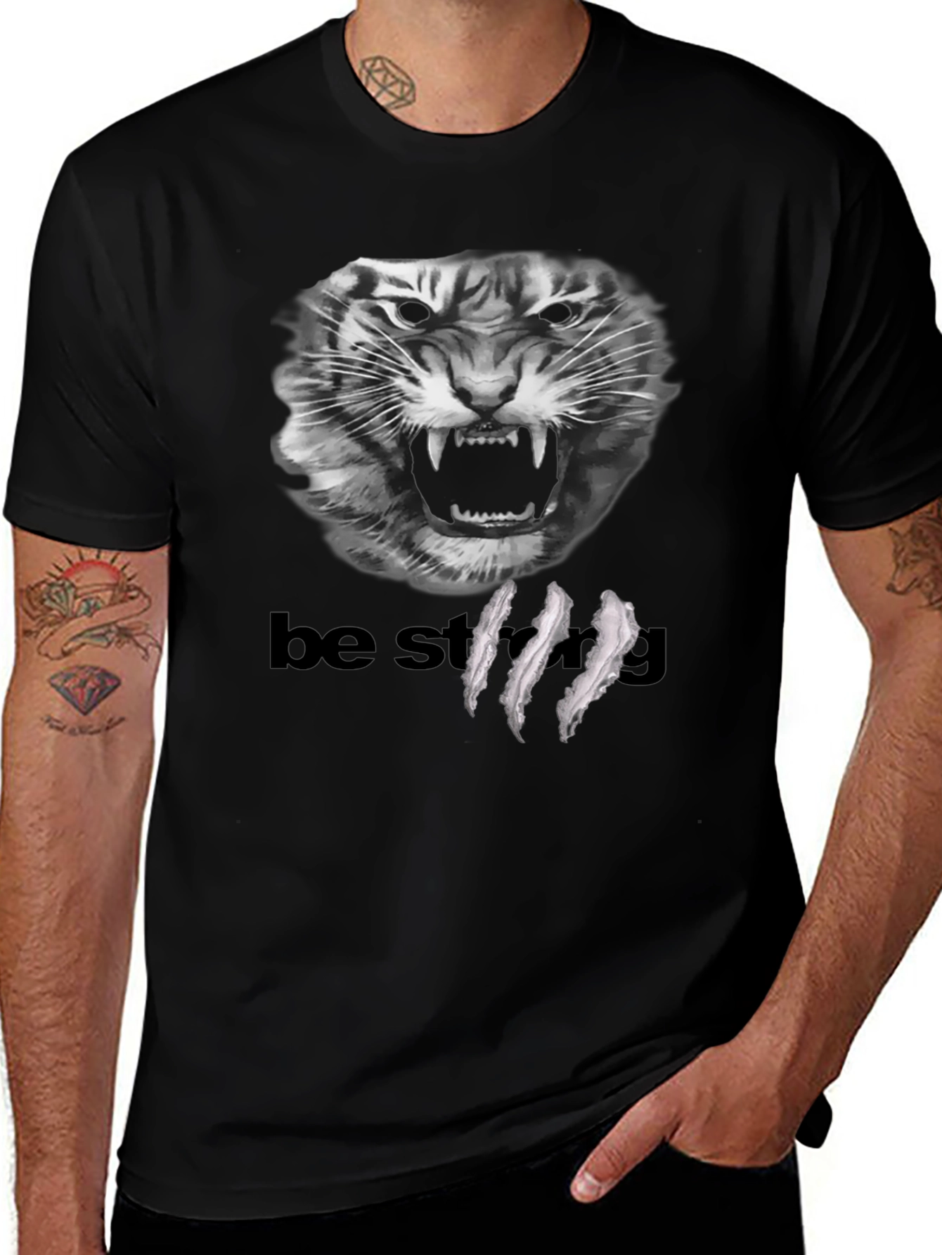 Unleash your inner strength with this bold black graphic tee. Featuring a fierce tiger face roaring with claw marks, and the inspiring words "be strong", this shirt makes a statement. The design is printed on a soft, comfortable fabric, likely cotton or a cotton blend, for all-day wear. Perfect for casual outings, gym sessions, or simply expressing your powerful personality. Embrace your wild side with this eye-catching and motivational t-shirt. Wear it as a reminder to stay strong and face any challenge.