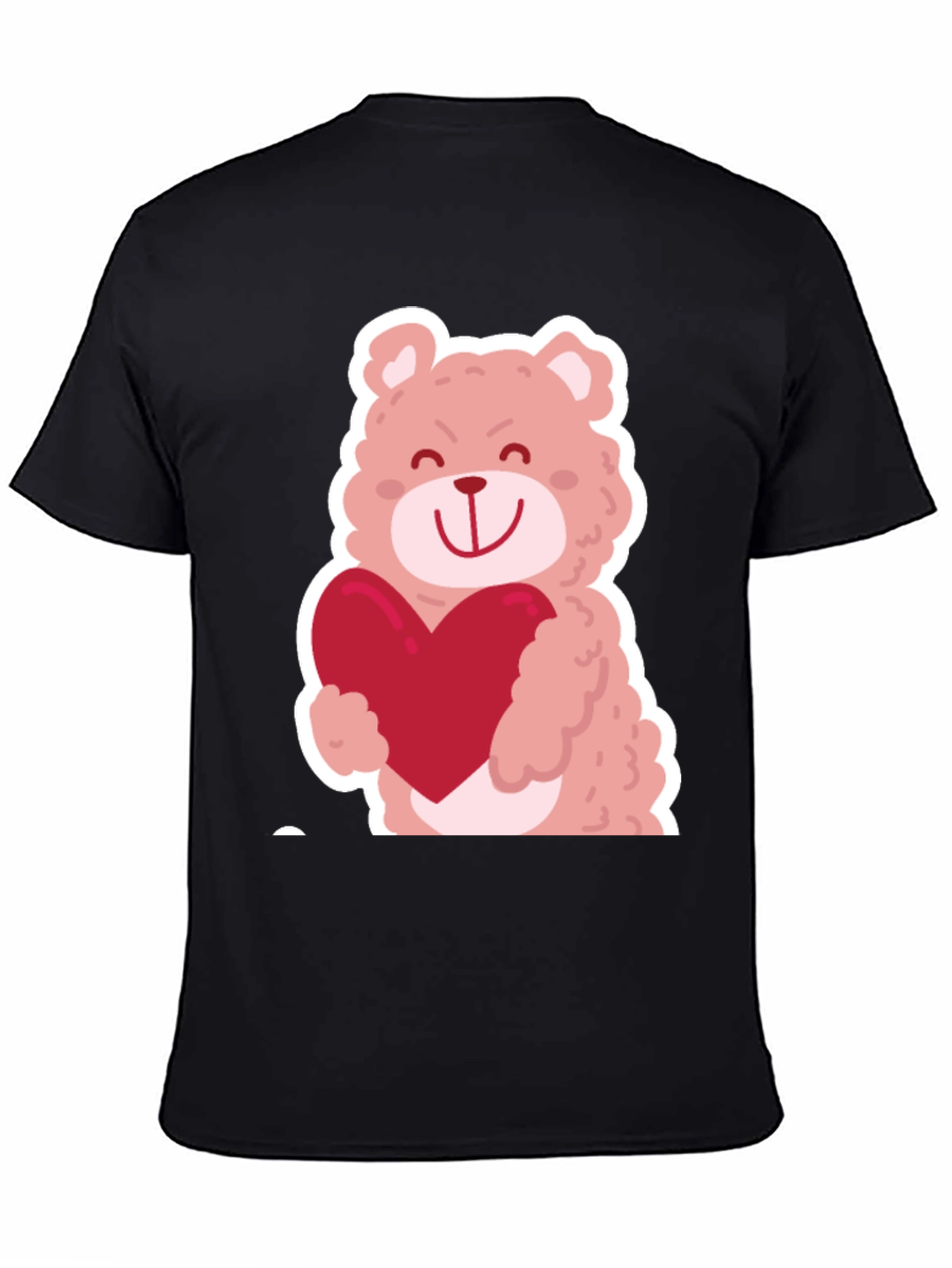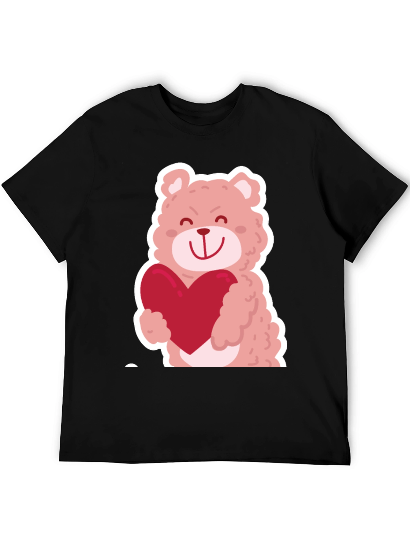 Show your love with this adorable black t-shirt featuring a charming cartoon bear holding a big, red heart. The design is bright and cheerful, making it a perfect casual wear item for expressing affection or simply spreading joy. This tee appears to be made from a soft, comfortable material, ideal for everyday wear. The classic black background makes the colorful graphic really pop! Wear it on Valentine's Day, anniversaries, or any day you want to showcase some love. It's also a great gift for friends, family, or that special someone. This fun t-shirt is sure to bring a smile to everyone's face!