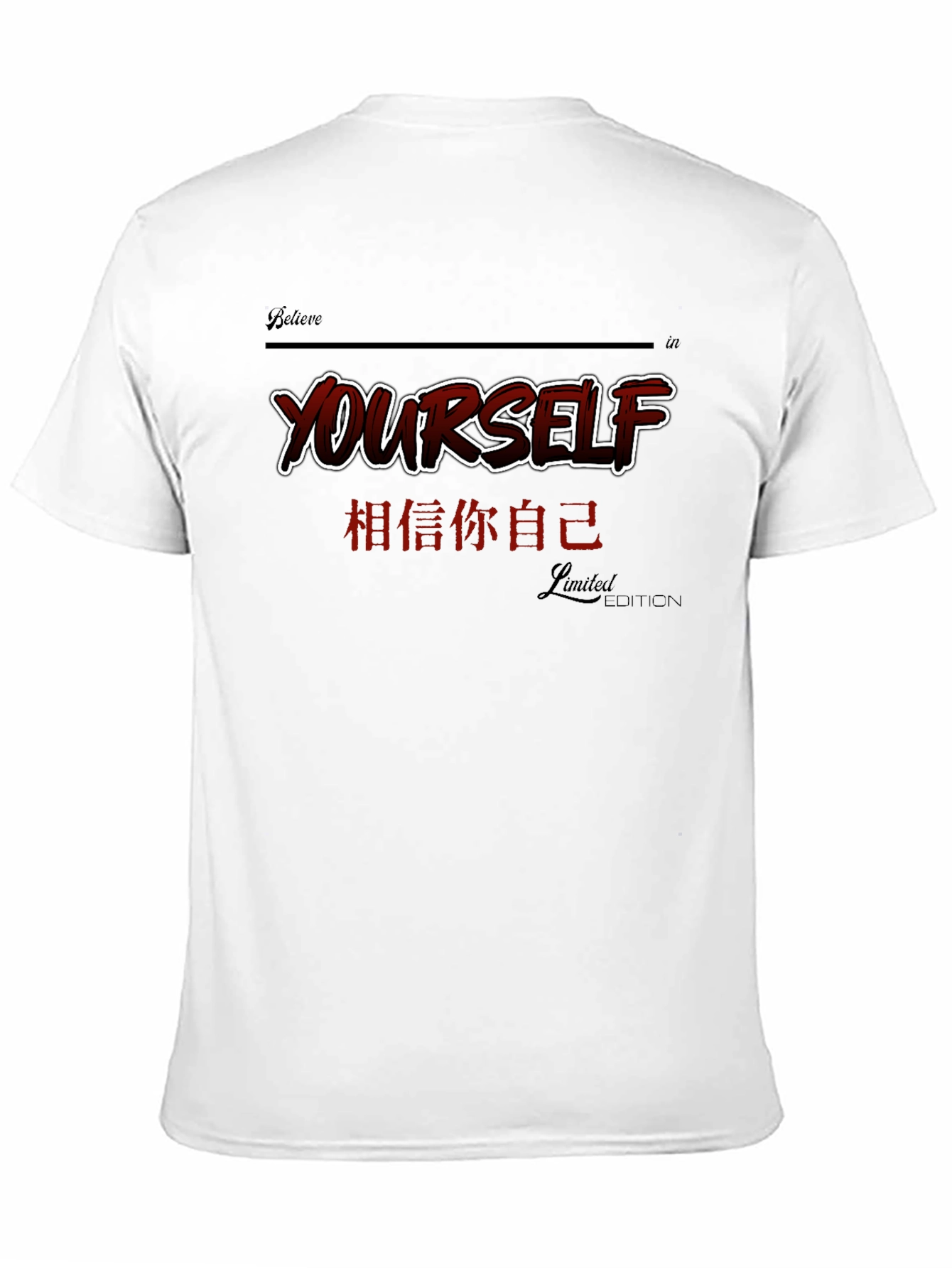 Embrace inner confidence with this black graphic t-shirt. Featuring a bold "Believe in Yourself" design alongside Chinese characters, this tee exudes a unique style. A horizontal line above with the word "Believe" and "in" shows this shirt is designed for empowerment. The limited edition detail adds exclusivity, making it a standout piece for casual wear. Perfect for everyday wear, expressing individuality, and adding a touch of positivity to your wardrobe. Made from soft, breathable fabric to ensure all-day comfort.