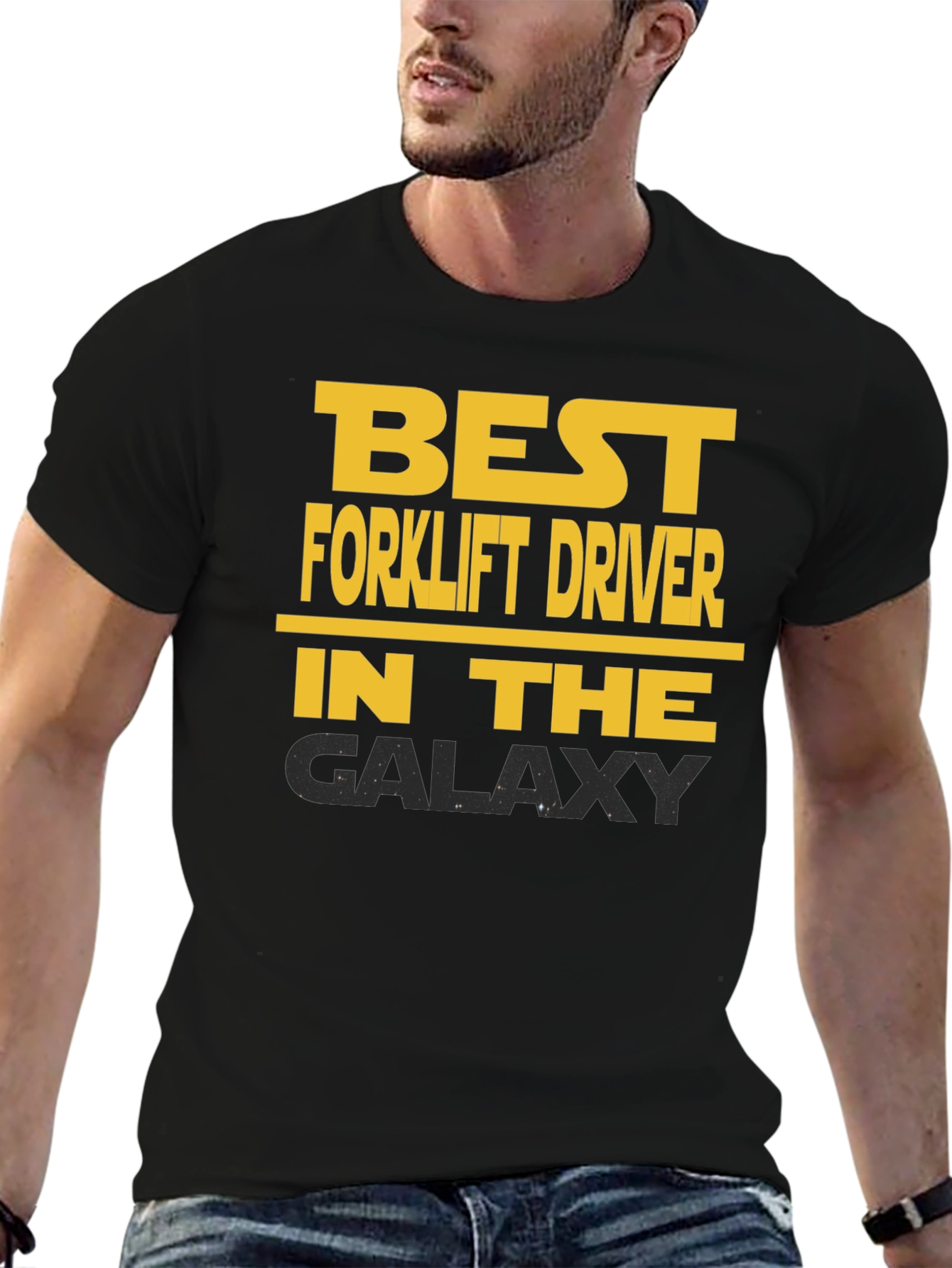 Show off your forklift skills with this fun t-shirt! Featuring the phrase 'Best Forklift Driver in The Galaxy', this bold design is sure to get some laughs. The text is in yellow, while the shirt itself is black. Made from a comfortable material, this tee is perfect for casual wear, work, or a fun gift for the forklift operator in your life. Get yours today!