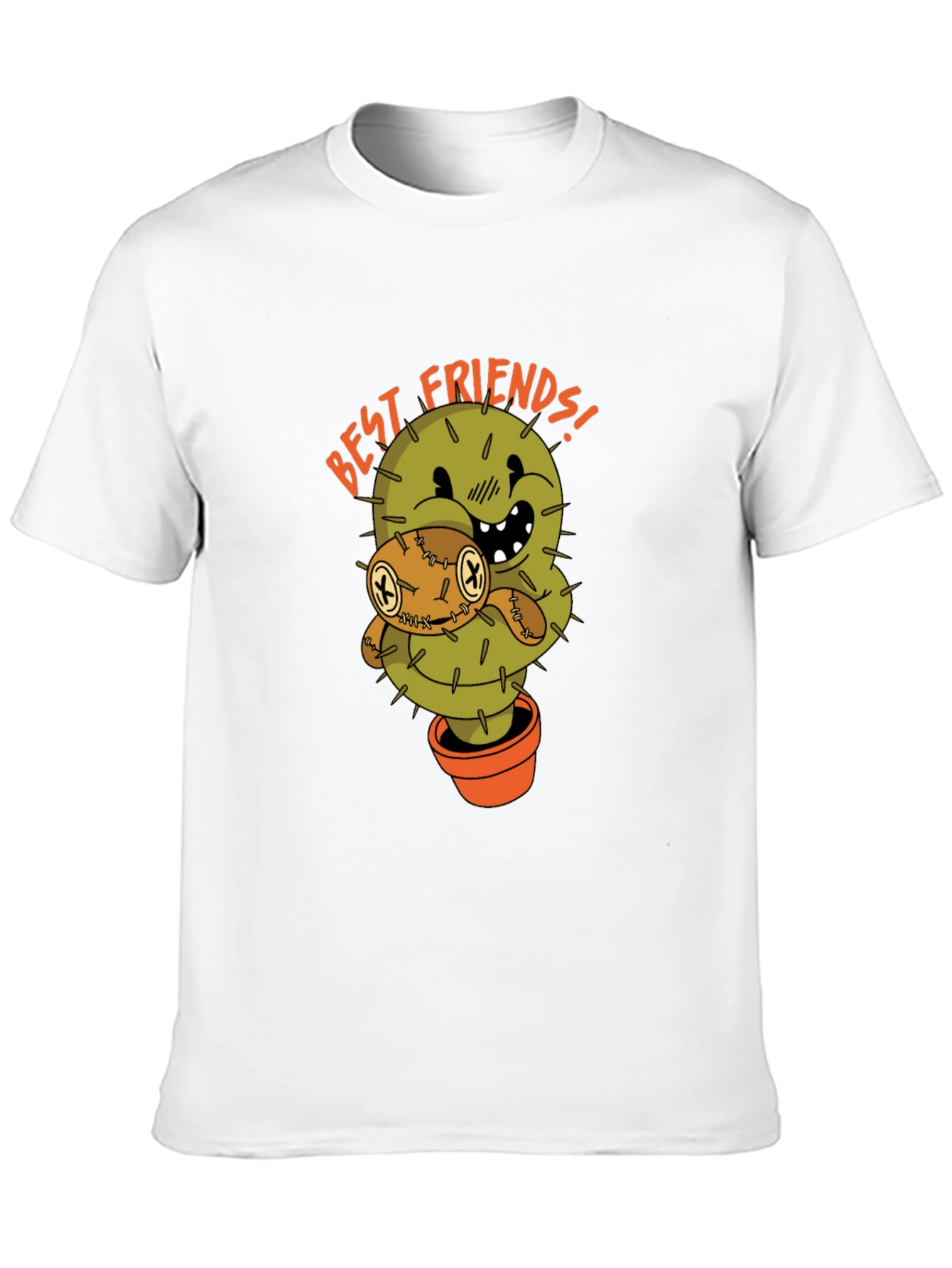 Showcase your playful side with this unique graphic t-shirt! This black tee features a quirky cartoon design of a happy green cactus hugging a brown voodoo doll. The text "BEST FRIENDS!" is displayed above the cactus in vibrant orange font, adding to the shirt's whimsical appeal. Made from a comfortable, breathable fabric, this t-shirt is perfect for casual wear. Ideal for expressing your fun personality, this shirt is sure to be a conversation starter wherever you go. Great for everyday use, novelty events, or as a gift for those with a unique sense of humor.
