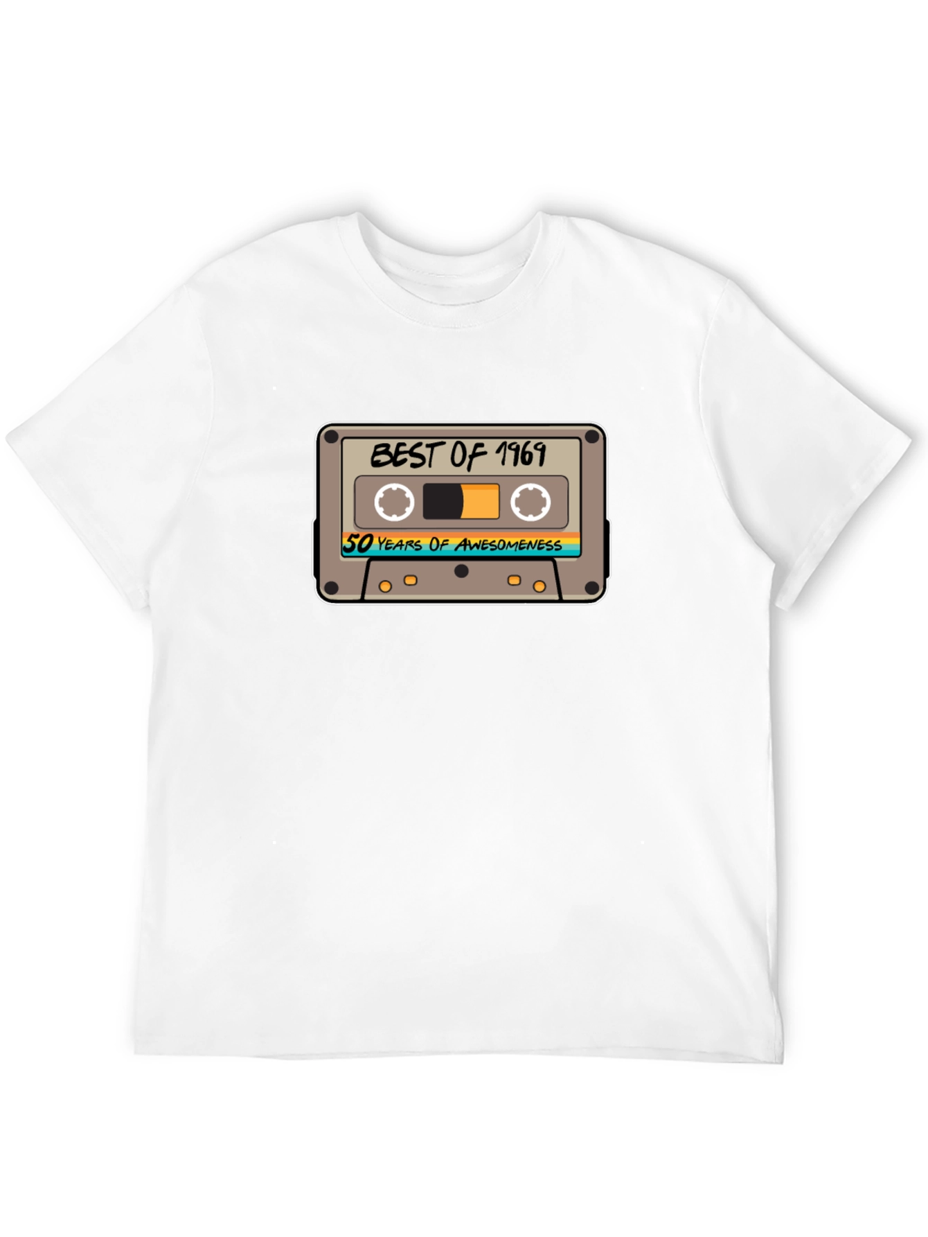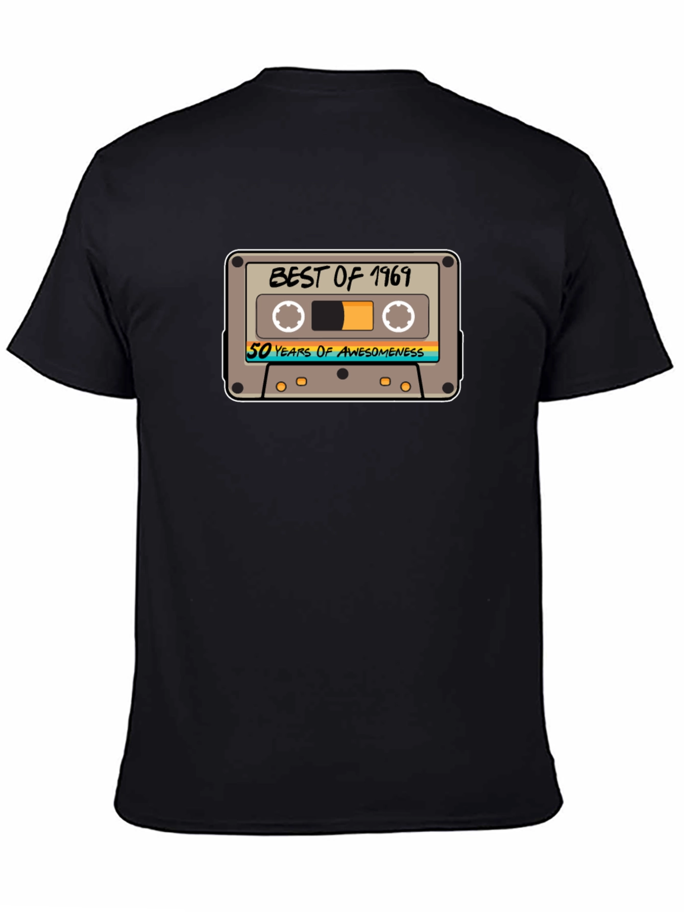 Celebrate a milestone with this retro-inspired t-shirt featuring a "Best of 1969" cassette tape design. This unique graphic celebrates 50 years of awesomeness with a nostalgic nod to vintage music culture. The design incorporates classic cassette tape elements, making it a perfect conversation starter and a fun way to show off your appreciation for iconic years. Made from comfortable, breathable fabric, this t-shirt is ideal for casual wear, parties, or as a memorable gift for someone special. Add a touch of retro charm to your wardrobe with this eye-catching and conversation-starting t-shirt.
