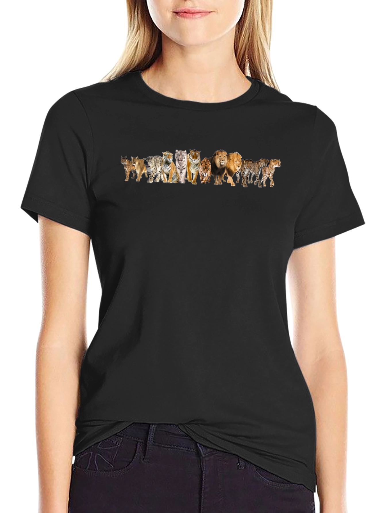 Show your love for wildlife with this unique black t-shirt. Featuring a detailed graphic print of various big cat species, including lions, tigers, and leopards, this tee is perfect for animal enthusiasts. The design is prominently displayed across the chest, offering a stylish and eye-catching look. Crafted from a comfortable, soft fabric, this shirt is ideal for everyday wear. Pair it with jeans or shorts for a casual, cool outfit. This durable and fashionable t-shirt is a must-have for anyone who appreciates nature and wants to make a statement.