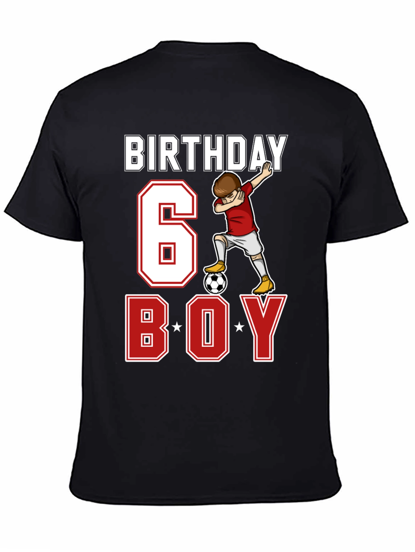 Celebrate your little soccer star's 6th birthday with this awesome t-shirt! This black tee features a fun design incorporating the word "BIRTHDAY", the number "6", and "BOY", all styled with a sporty red and white outline. A cartoon soccer player is dabbing over a soccer ball in a red and white uniform, adding a playful touch. It's perfect for a birthday party, soccer practice, or casual wear. Make their special day even more memorable with this unique and comfortable t-shirt.