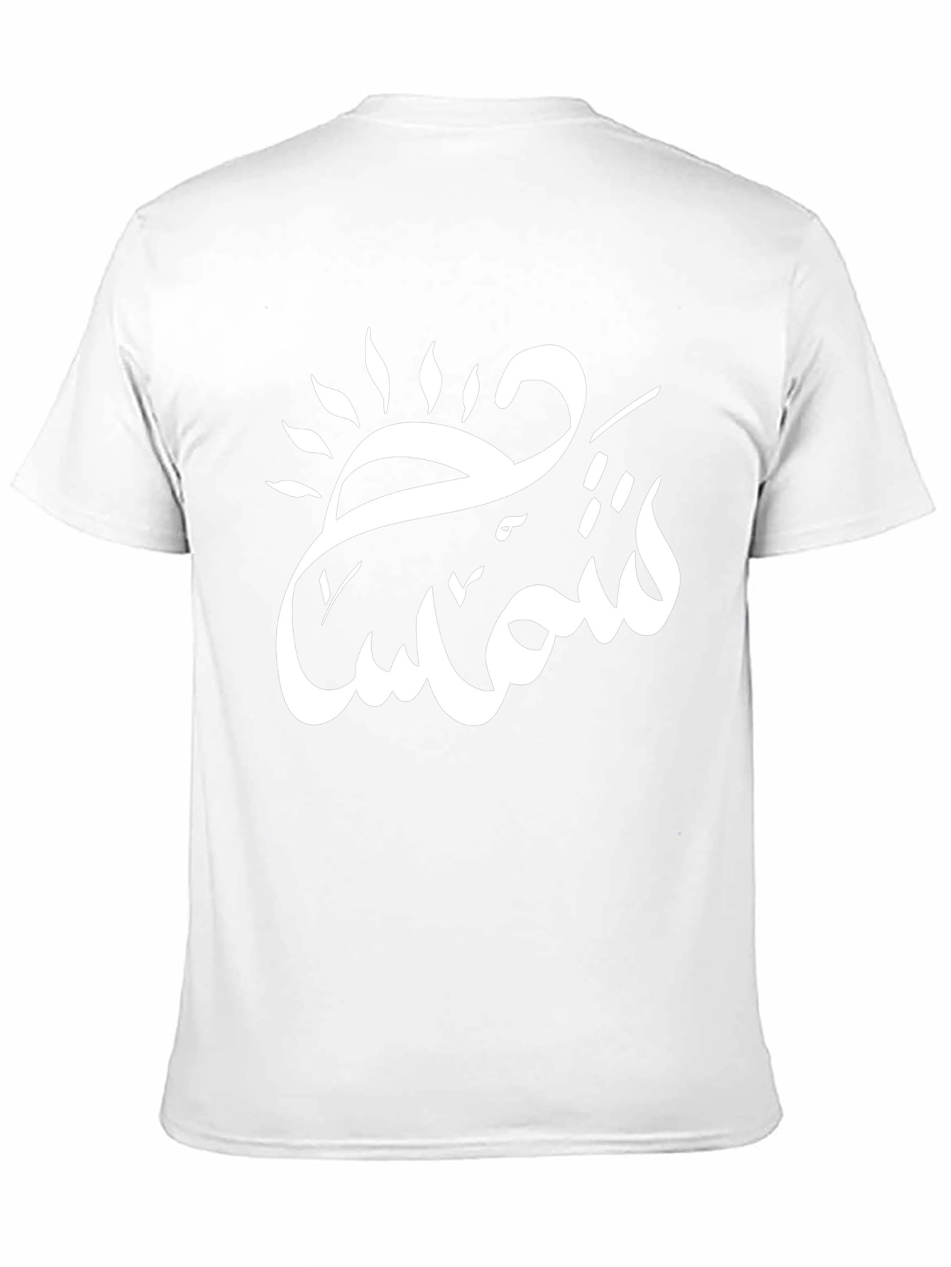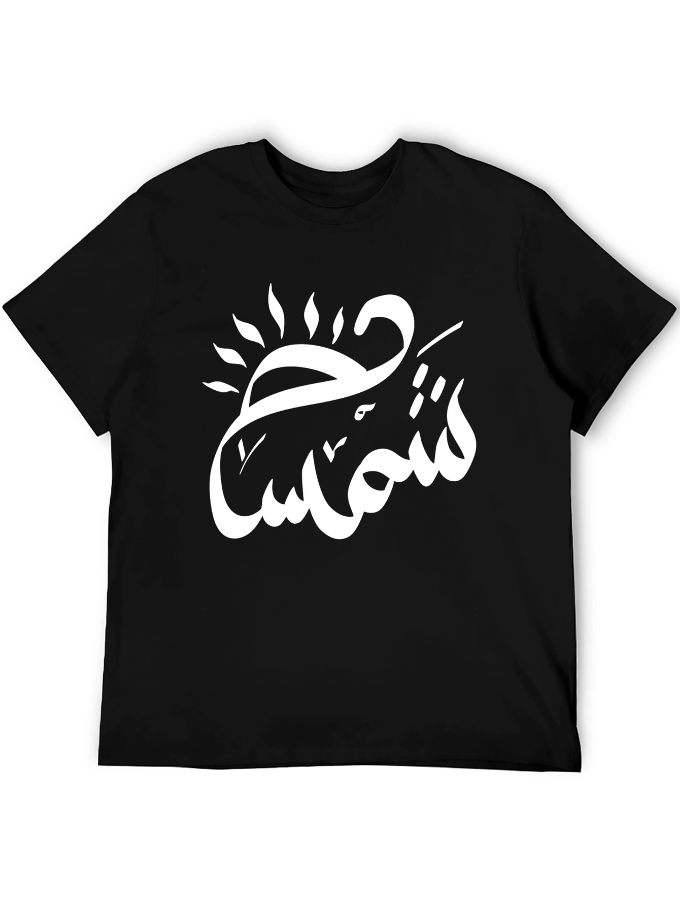 Show off your unique style with this sleek black t-shirt. Featuring a striking white Arabic calligraphy design resembling a sun, this tee is sure to turn heads. The bold contrast of the white graphic against the dark fabric creates a modern and eye-catching look. Made from a comfortable, breathable material, this t-shirt is perfect for everyday wear. Whether you're hanging out with friends, running errands, or just relaxing at home, this stylish tee will keep you feeling cool and looking sharp. Pair it with jeans, shorts, or joggers for a versatile and fashionable outfit.