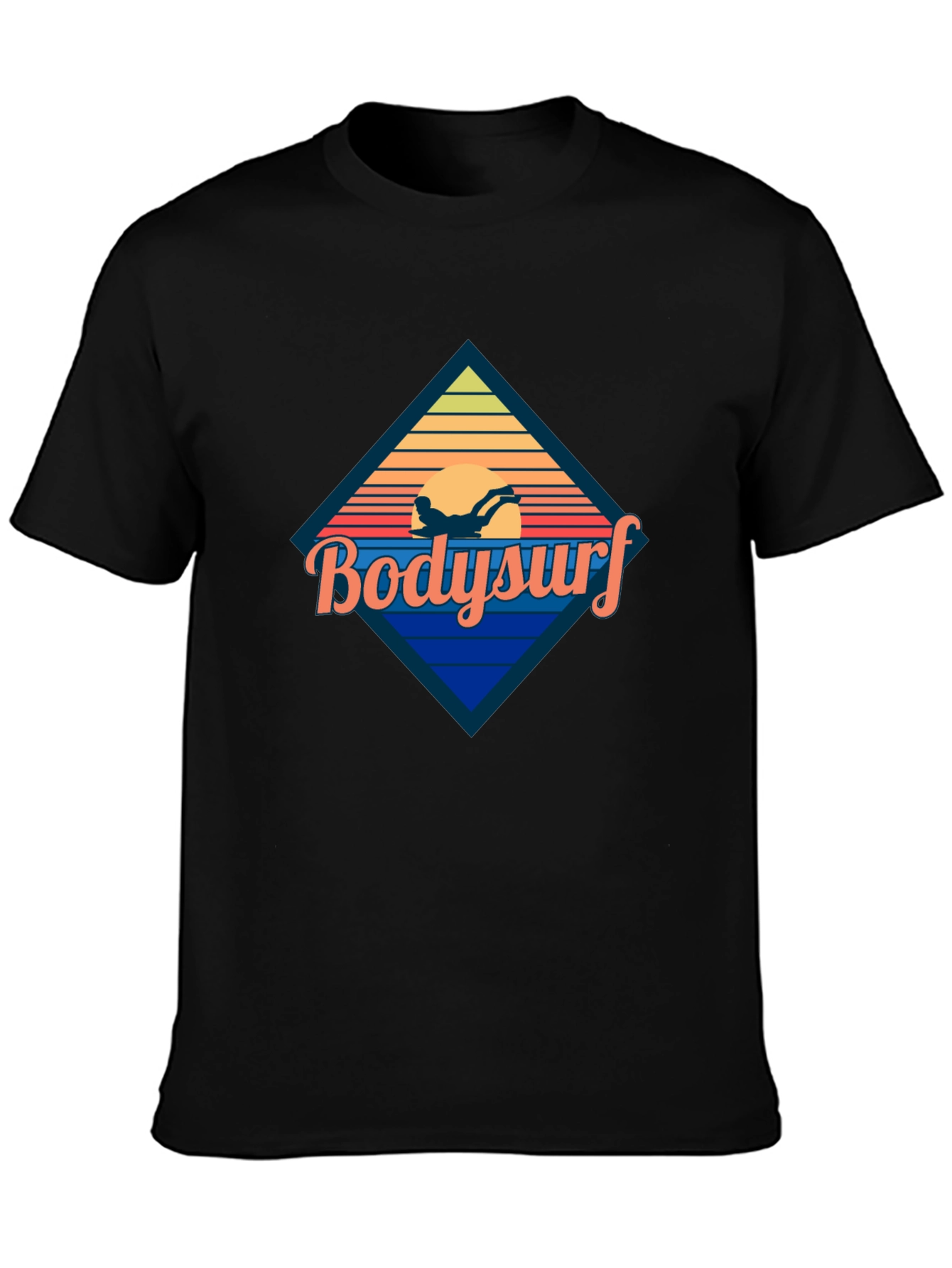 Dive into retro style with this black t-shirt featuring a vintage-inspired 'Bodysurf' graphic. The design showcases a stylized silhouette of a bodysurfer against a vibrant sunset backdrop, framed within a diamond shape with horizontal stripes. The classic fit and soft fabric make it perfect for casual wear, beach outings, or simply relaxing in style. Show off your love for the ocean and vintage vibes with this unique and eye-catching tee. Ideal for surfers, beach lovers, and anyone who appreciates a touch of retro cool in their wardrobe. This shirt is a must-have addition to your collection.