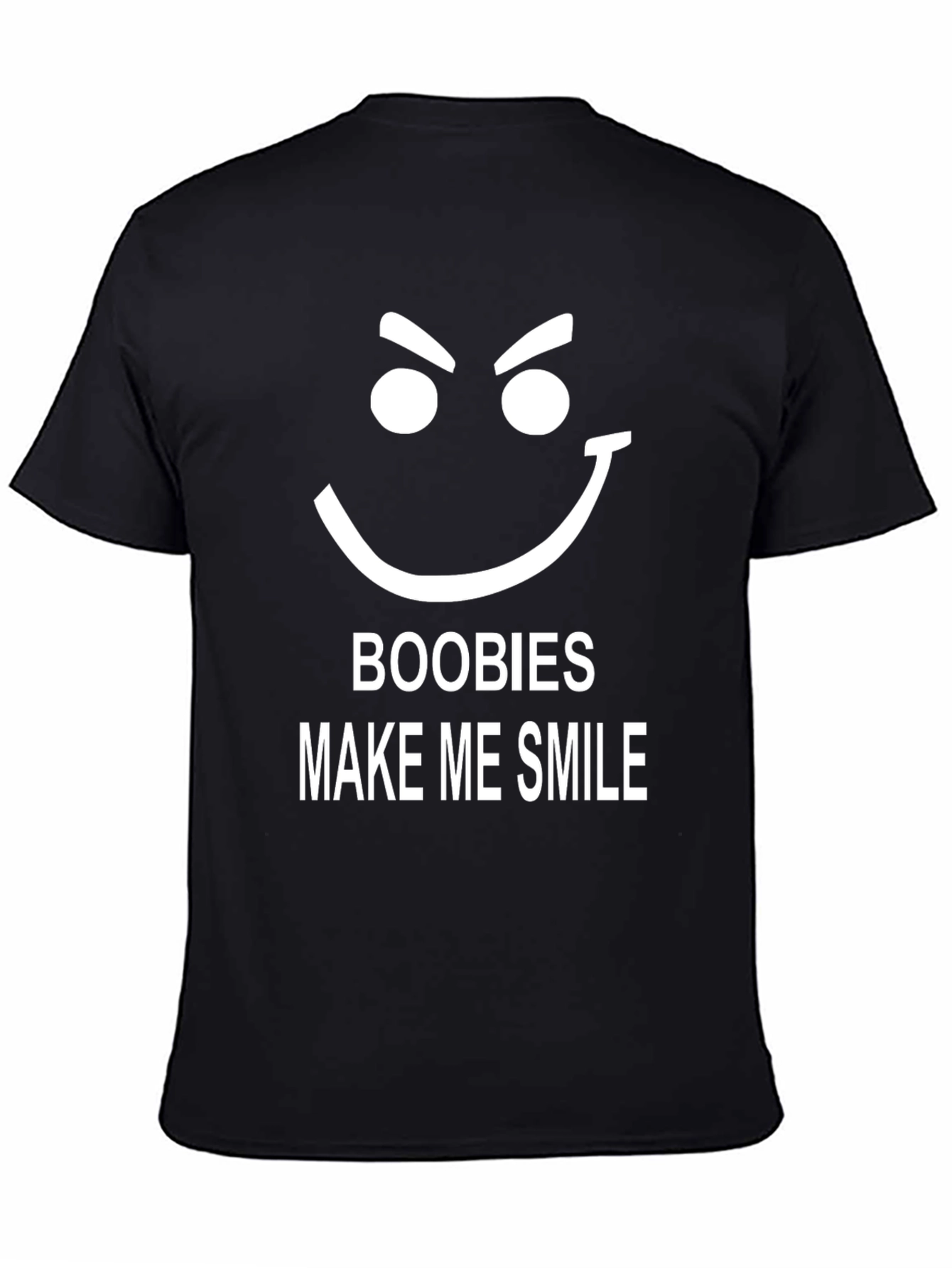 This black graphic tee features a bold, cheeky design. A minimalist smiley face with raised eyebrows sits above the phrase "BOOBIES MAKE ME SMILE" printed in white, creating a playful contrast. The short-sleeved shirt is made from what appears to be a soft, comfortable cotton blend, making it ideal for casual wear. The design is eye-catching and bound to be a conversation starter. Perfect for a relaxed day out, a casual get-together, or anyone with a sense of humor. This tee combines comfort, style, and a bold statement, making it a unique addition to your wardrobe.