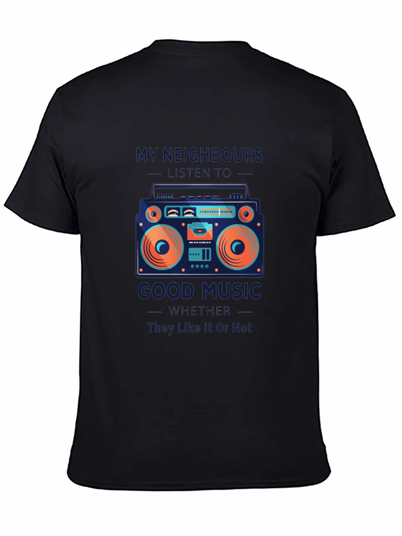 Make a statement with this unique t-shirt featuring a vintage boombox graphic! The eye-catching design includes a retro boombox illustration with vibrant colors. Boldly declares, "My Neighbours Listen to GOOD MUSIC Whether They Like It Or Not". This shirt is perfect for music lovers and anyone with a sense of humor. Great for casual wear, music festivals, or as a fun gift. Made from comfortable materials, this t-shirt offers both style and comfort. Show off your love for classic tunes with this standout tee.