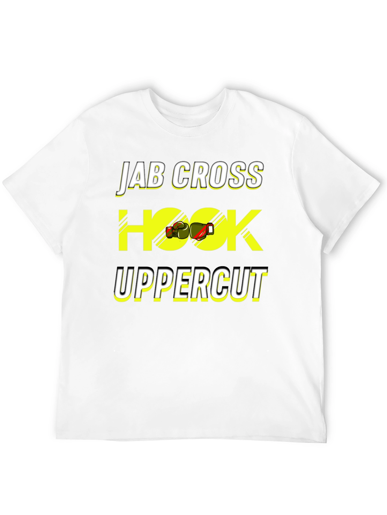 Show off your love for boxing with this stylish black t-shirt. Featuring a bold graphic design that spells out "JAB CROSS HOOK UPPERCUT" in eye-catching yellow font, this tee is sure to turn heads. The word 'HOOK' cleverly incorporates boxing gloves within the design, adding a unique touch. Perfect for casual wear, workouts, or hitting the gym. Made from a soft, comfortable fabric, this shirt offers both style and comfort. Ideal for boxers, trainers, or anyone passionate about the sport.