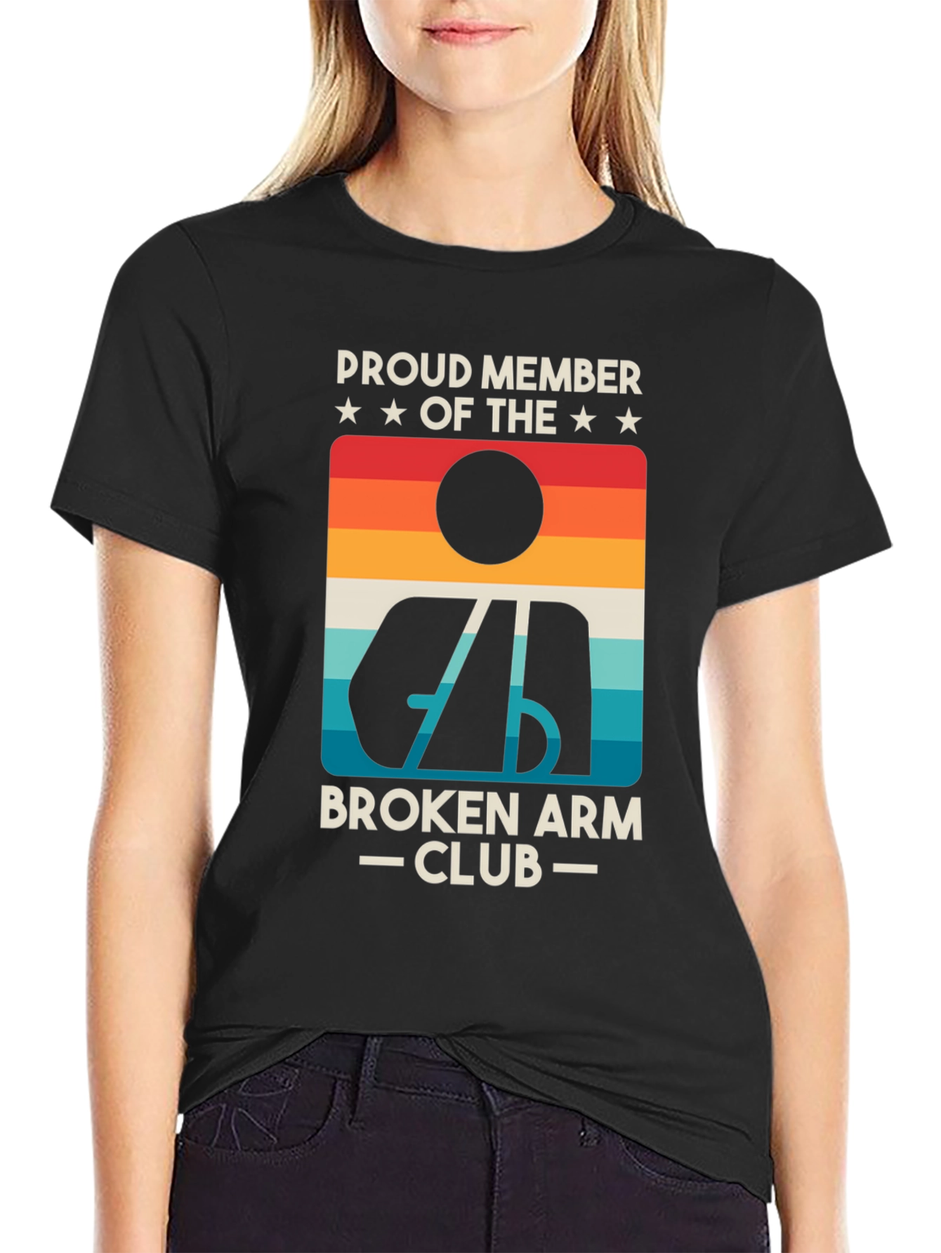 Show off your humor and solidarity with this unique 'Proud Member of the Broken Arm Club' t-shirt. Featuring a vintage-inspired design with a stylized figure in a sling set against colorful horizontal stripes, this tee is perfect for anyone who's experienced the joys of a broken arm. The bold graphic and clear text make a statement, while the classic crew neck and comfortable fabric ensure all-day wearability. It is great conversation starter and a fun way to lighten the mood during recovery. Ideal for casual outings, doctor's appointments, or just lounging at home.