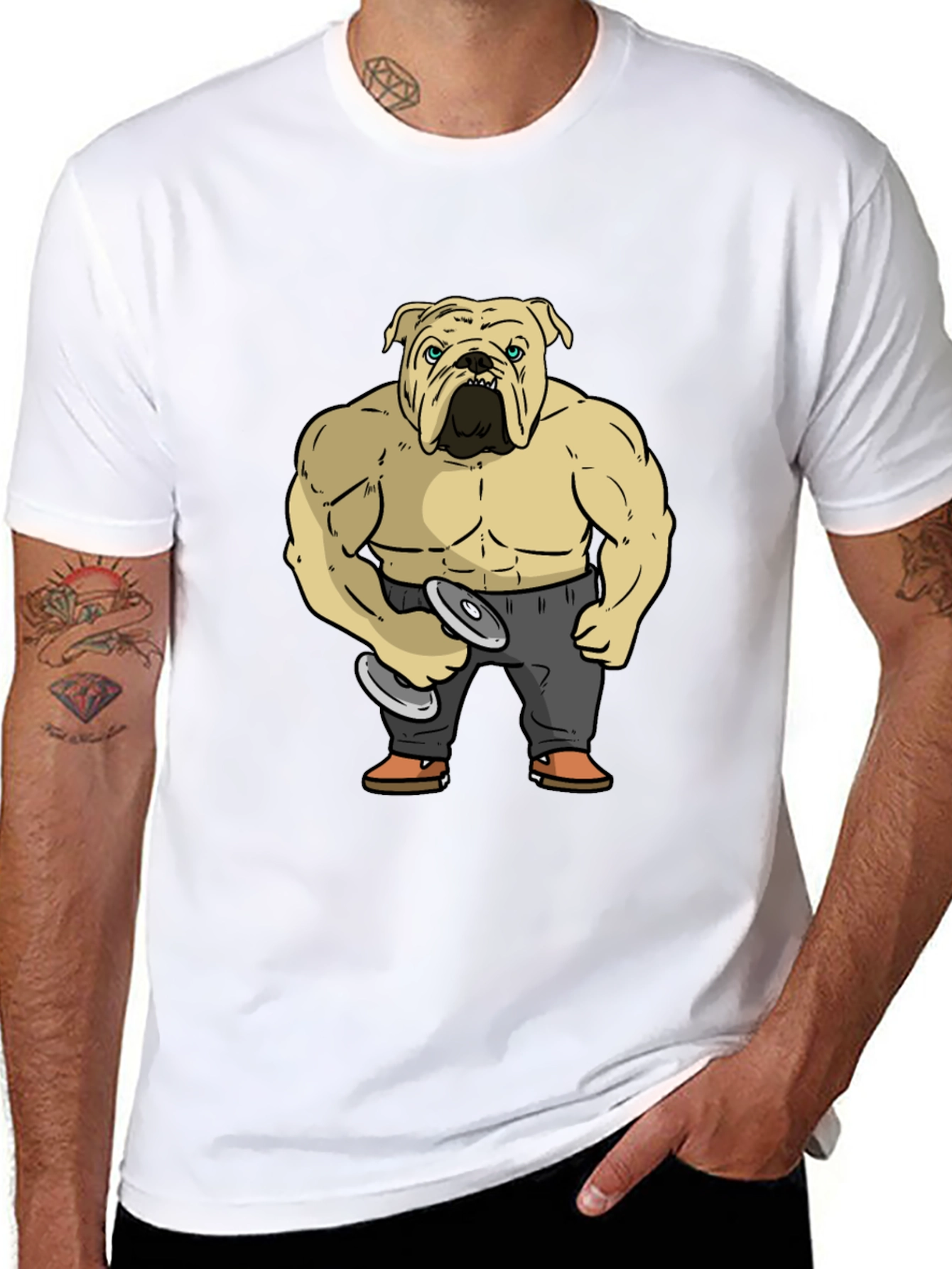Show off your love for dogs and fitness with this unique graphic t-shirt. The black tee features a cartoon bulldog with a muscular physique, lifting weights. It's a playful design that combines humor and strength. Made from a comfortable fabric, this tee is perfect for casual wear, gym sessions, or dog park outings. The eye-catching graphic is sure to spark conversations and smiles wherever you go. Express your unique style with this one-of-a-kind bulldog bodybuilder tee!