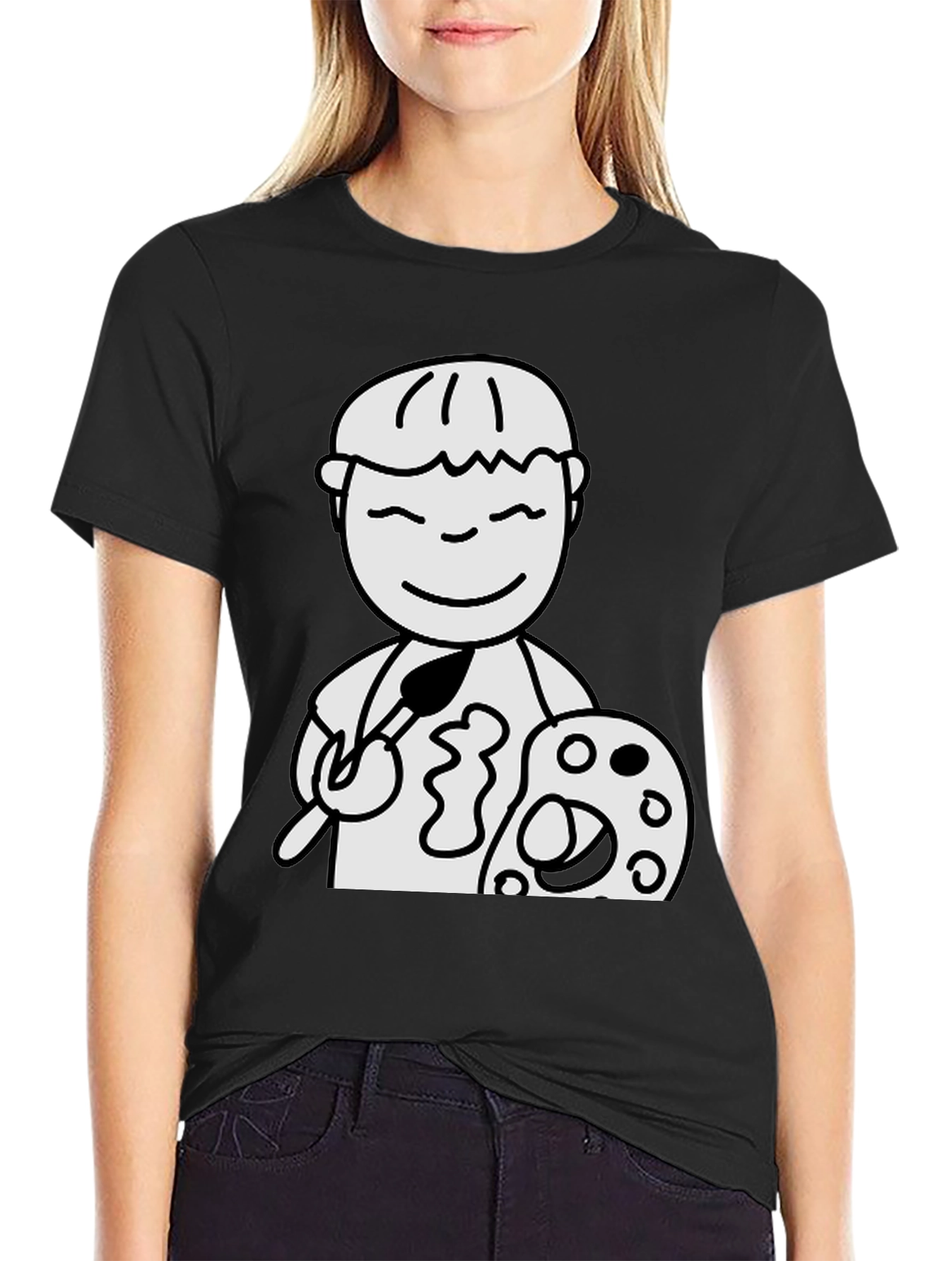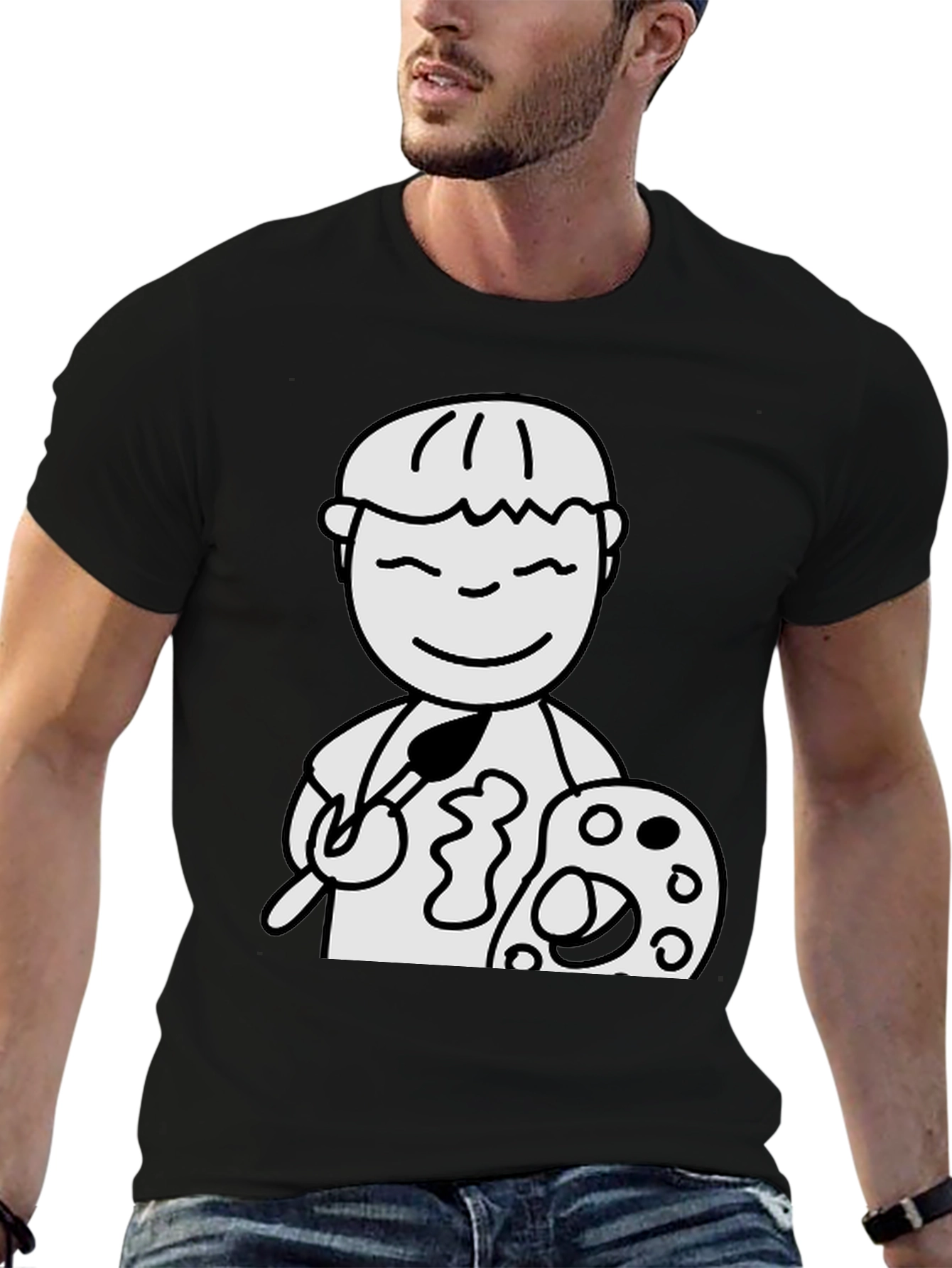 Express your artistic side with this unique black t-shirt featuring a charming cartoon artist graphic. The design showcases a simple yet captivating illustration of a character holding a paintbrush and palette, suggesting a love for creativity and the arts. Made from soft, breathable cotton, this tee offers all-day comfort and durability. This t-shirt is perfect for casual wear, art classes, or as a thoughtful gift for the creative individuals in your life. The bold graphic stands out against the classic black background, making it a versatile addition to any wardrobe. Show off your passion for art with this eye-catching and comfortable tee!