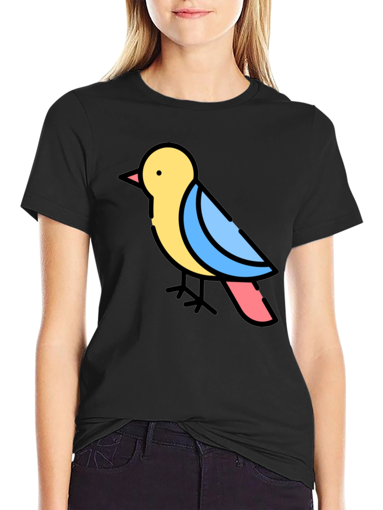 This stylish black t-shirt features a vibrant cartoon bird design, adding a touch of whimsy to your wardrobe. The bird graphic is eye-catching with its bright yellow body, blue wing, and pink tail, all outlined with black for a bold look. Perfect for casual wear, this tee is comfortable and sure to turn heads. Pair it with jeans, shorts, or your favorite bottoms for an effortlessly cool style. Ideal for bird lovers and anyone who appreciates unique, playful designs.