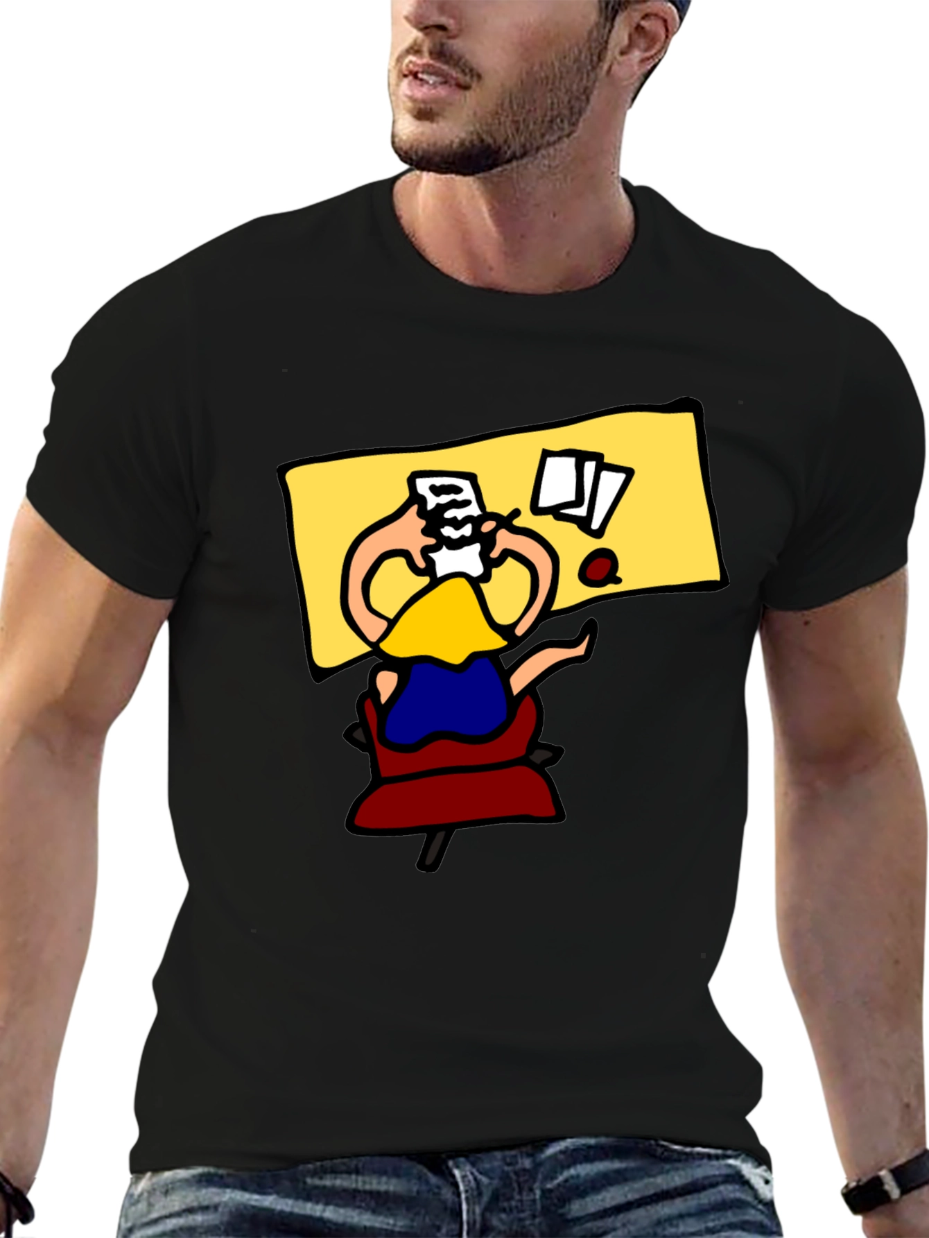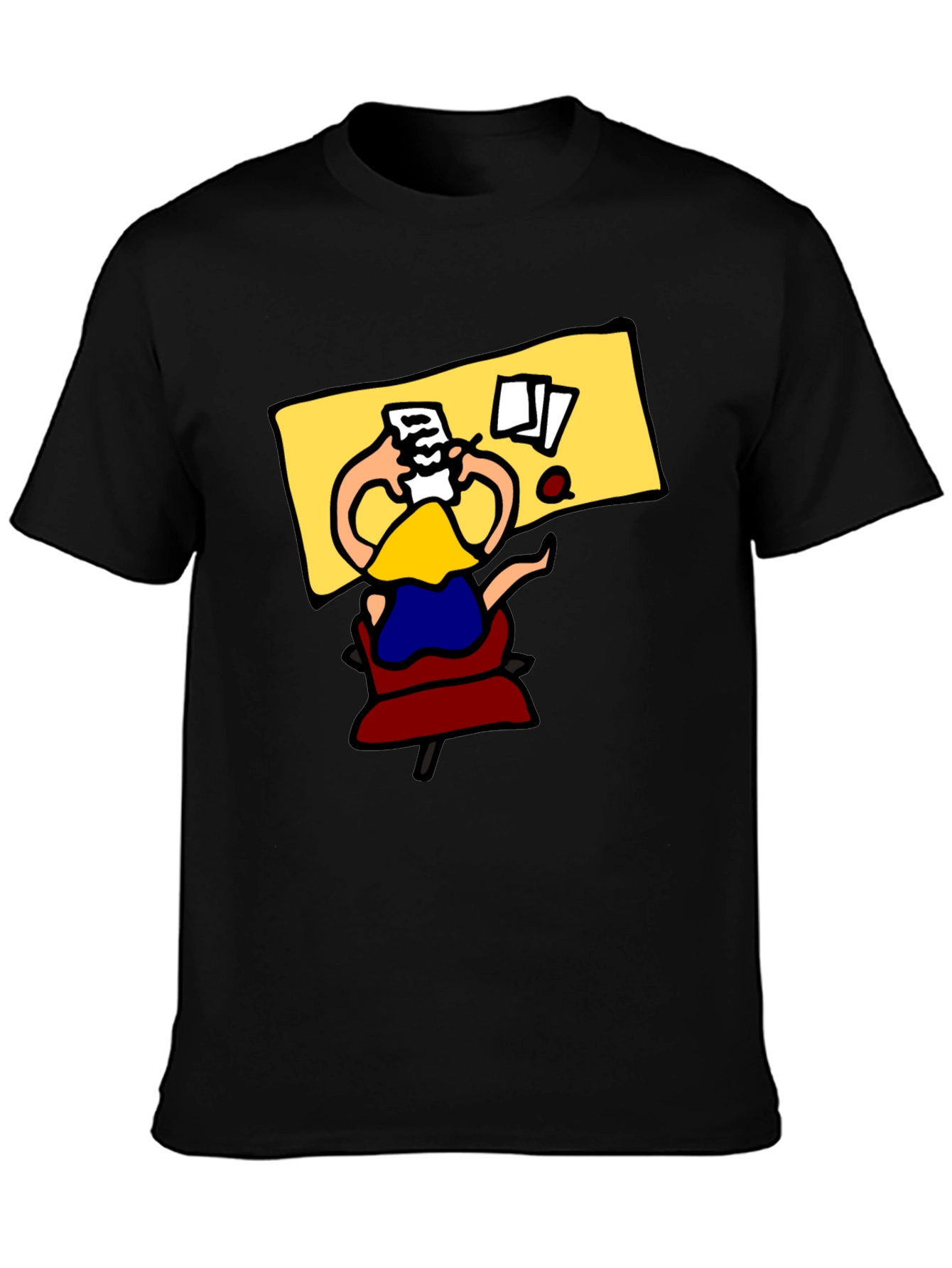 Express your unique style with this eye-catching black t-shirt featuring a vibrant cartoon design. The graphic depicts a person seated at a desk, surrounded by papers and a pencil, creating a playful and relatable image for writers, students, or anyone who enjoys a creative workspace aesthetic. Made from a comfortable, breathable fabric, this tee is perfect for everyday wear. Pair it with jeans for a casual look or dress it up with a blazer for a more polished style. Stand out from the crowd with this fun and quirky addition to your wardrobe!
