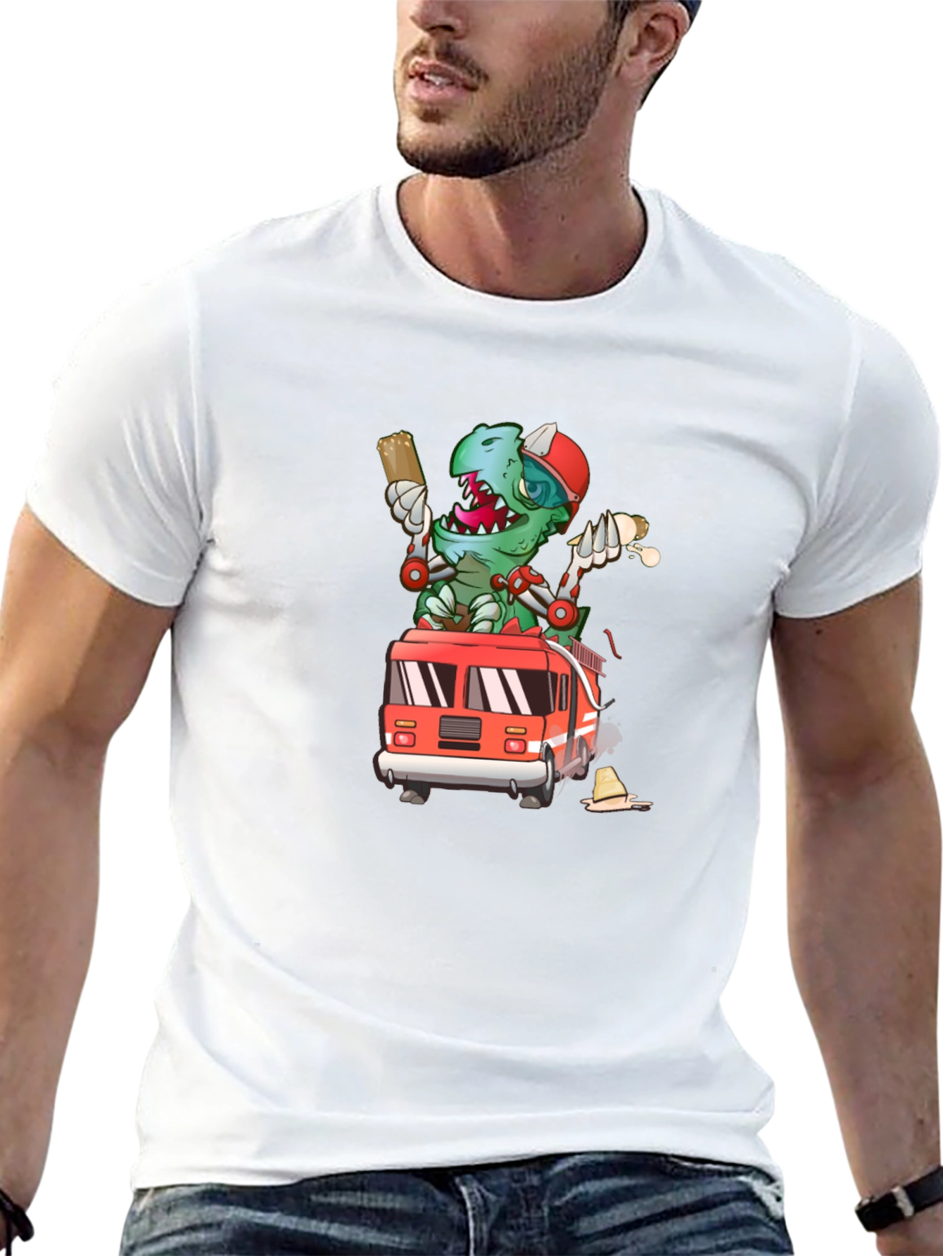 This unique t-shirt features a vibrant and eye-catching design of a cartoon dinosaur firefighter riding atop a fire truck. The dinosaur is depicted in a playful manner, adding a touch of whimsy and fun to the garment. The design is printed on a black, classic-fit t-shirt, made from what appears to be a comfortable and durable fabric. This t-shirt is perfect for casual wear, making a statement and expressing your unique personality. It's ideal for dinosaur enthusiasts, firefighters, or anyone who loves fun and quirky designs. Wear it to school, social gatherings, or simply while running errands to add a touch of fun to your day.