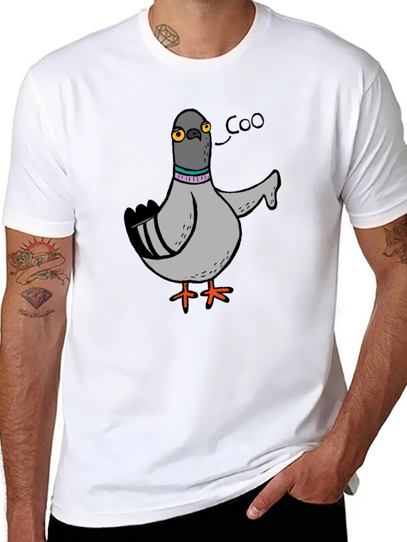 This black t-shirt features a unique cartoon graphic of a pigeon, complete with an amusing "Coo" speech bubble. The design showcases a gray pigeon with distinctive orange feet and a colorful collar, adding a touch of whimsy to your wardrobe. Made from a comfortable-looking fabric, this tee is perfect for casual wear and expressing your fun-loving personality. Ideal for everyday wear, quirky events, or as a standout piece in your casual collection. Show off your unique sense of style with this eye-catching pigeon graphic tee!