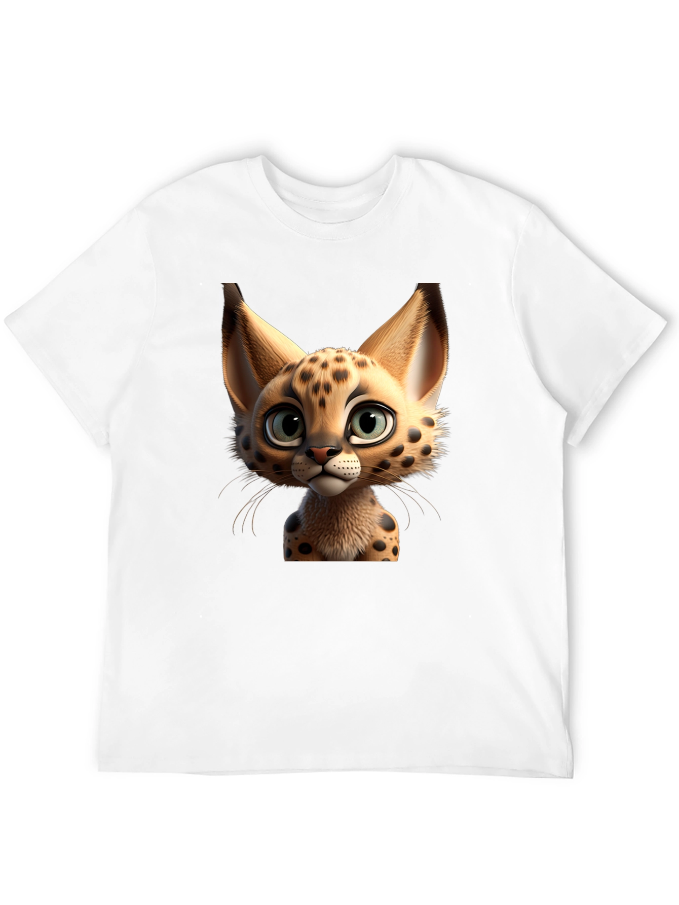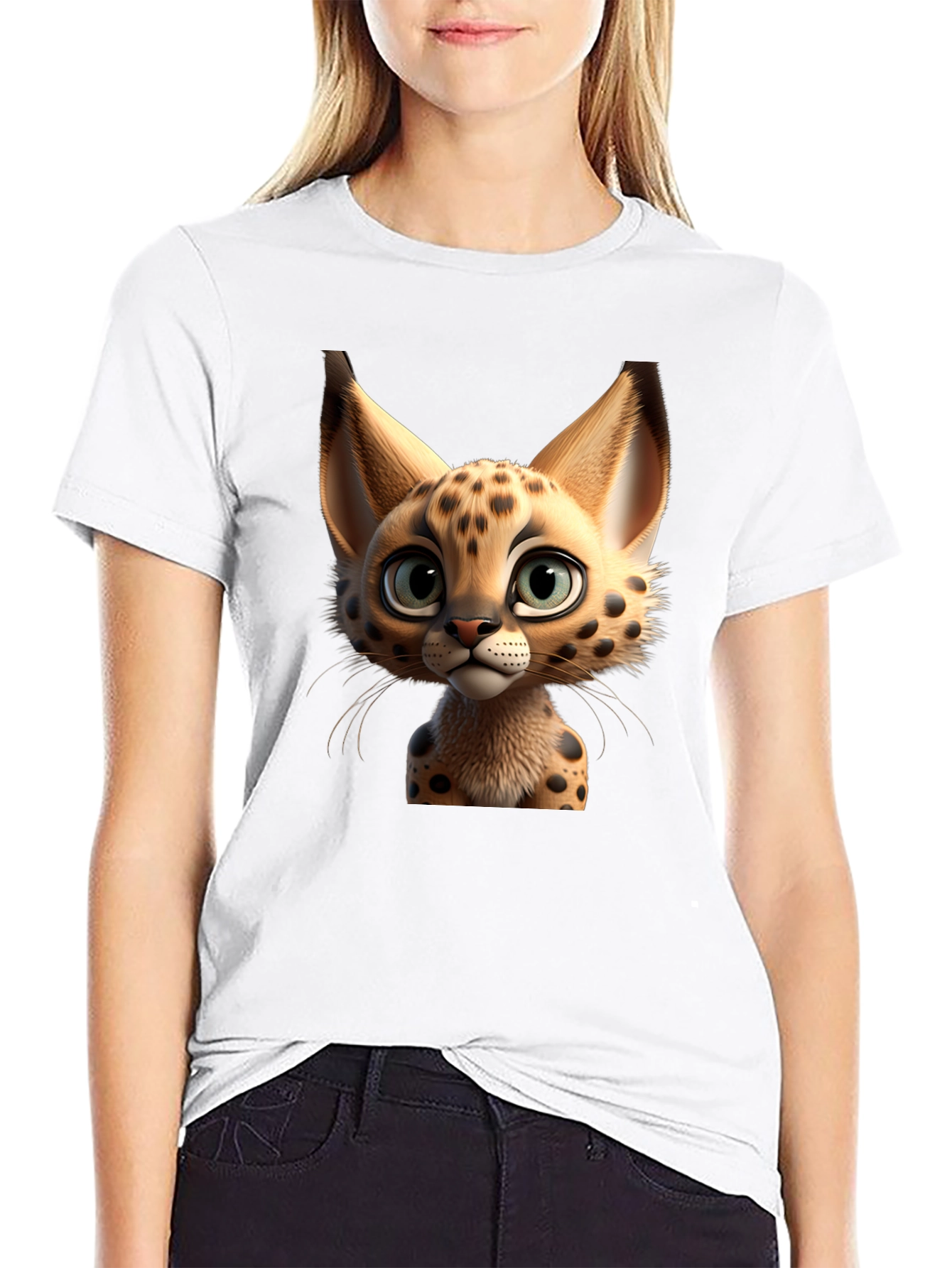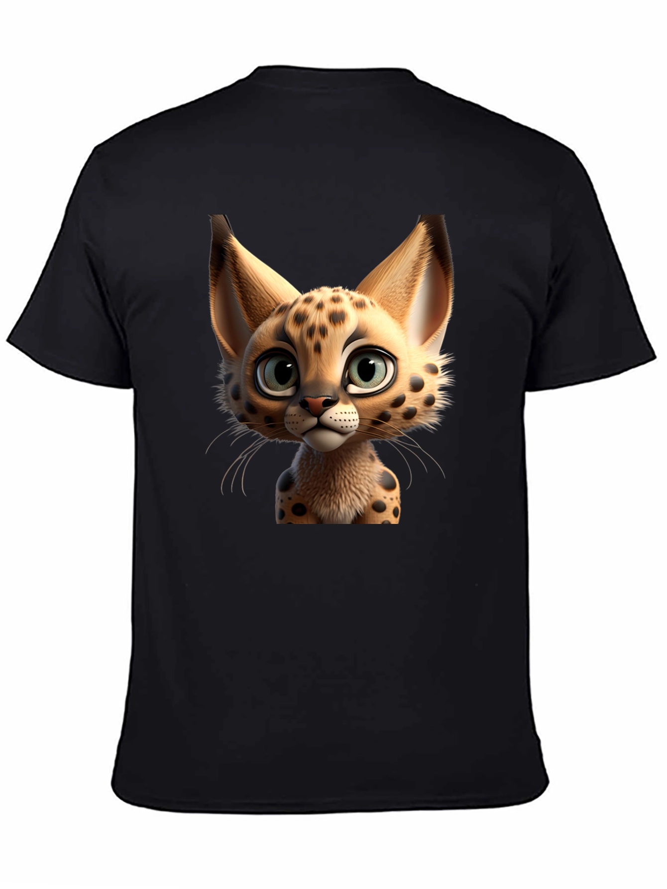 This black t-shirt features a vibrant and adorable cartoon serval cat graphic. The detailed illustration showcases the serval's distinctive spotted fur, large ears, and expressive eyes, creating a playful and eye-catching design. Made from a comfortable-looking fabric, this t-shirt is perfect for casual wear. It's a great way to show off your love for animals or add a fun touch to your everyday style. Wear it for a day out, a casual gathering, or simply relaxing at home. This unique tee is sure to be a conversation starter!
