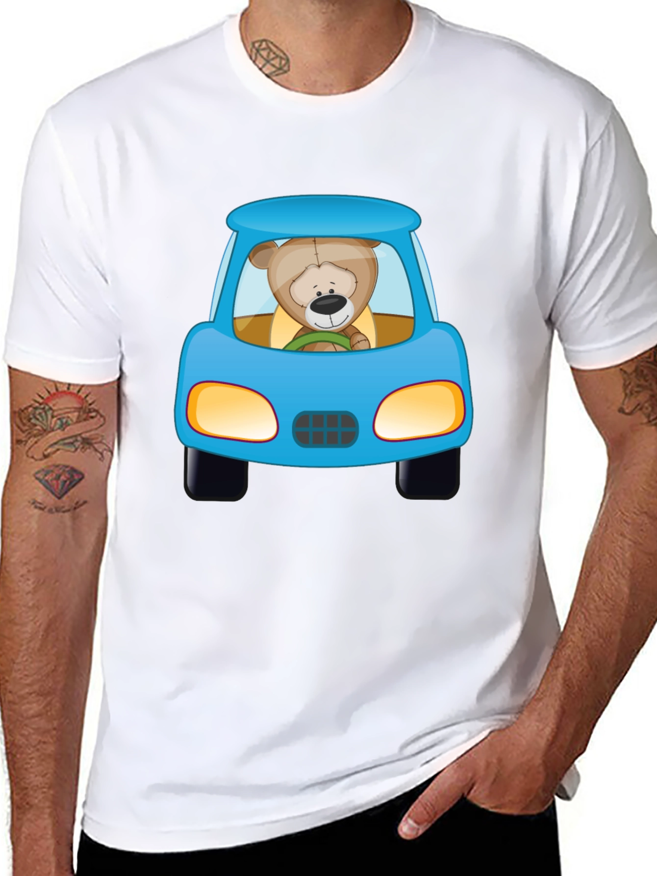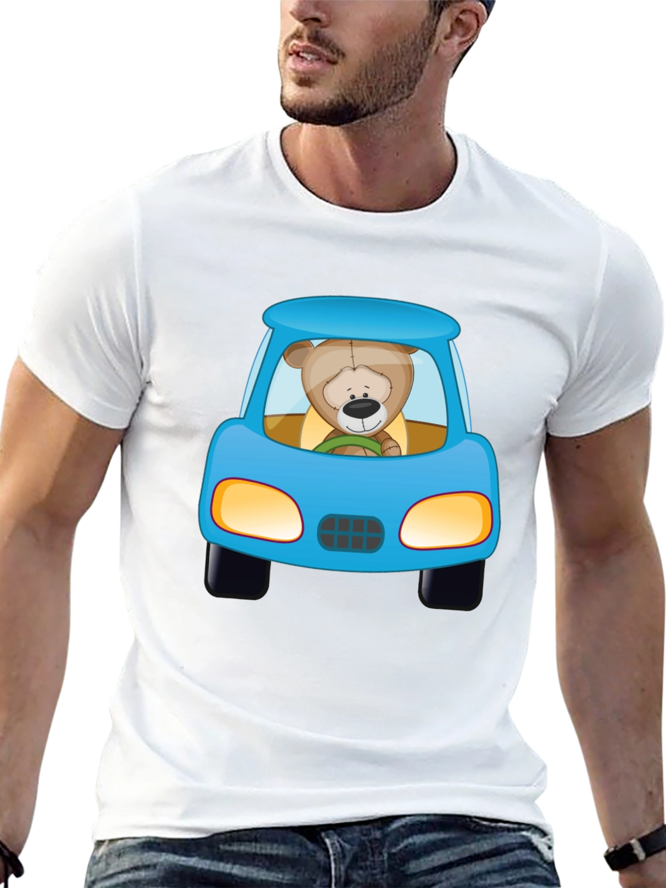 Drive into fun with this playful black t-shirt featuring a cute cartoon graphic! The design showcases a teddy bear happily driving a bright blue car with yellow headlights, making it a whimsical and eye-catching piece. Made from a comfortable-looking fabric, this tee is perfect for casual wear, adding a touch of lightheartedness to any outfit. Ideal for those who love unique and cheerful designs, this t-shirt is sure to be a conversation starter. Wear it to express your fun-loving personality and stand out from the crowd!