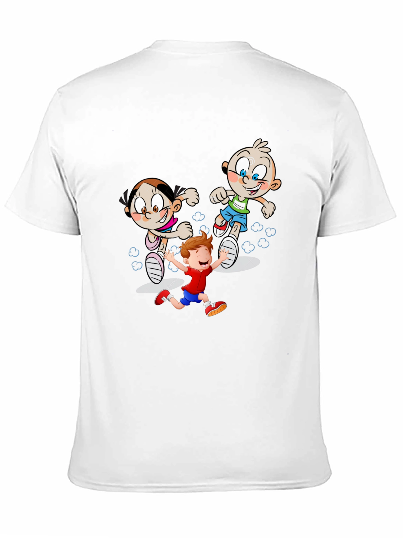 This unique black t-shirt features a playful yet spooky graphic design of two cartoon zombies chasing a delighted little boy. The print showcases vibrant colors, with the boy in a red shirt and blue shorts, contrasted by the muted tones of the cartoon zombies. The shirt itself appears to be made of a comfortable, breathable fabric. This tee is perfect for casual wear, comic conventions, Halloween events, or anyone with a quirky sense of style. Its bold graphic is sure to catch attention and spark conversation. A standout addition to any wardrobe!