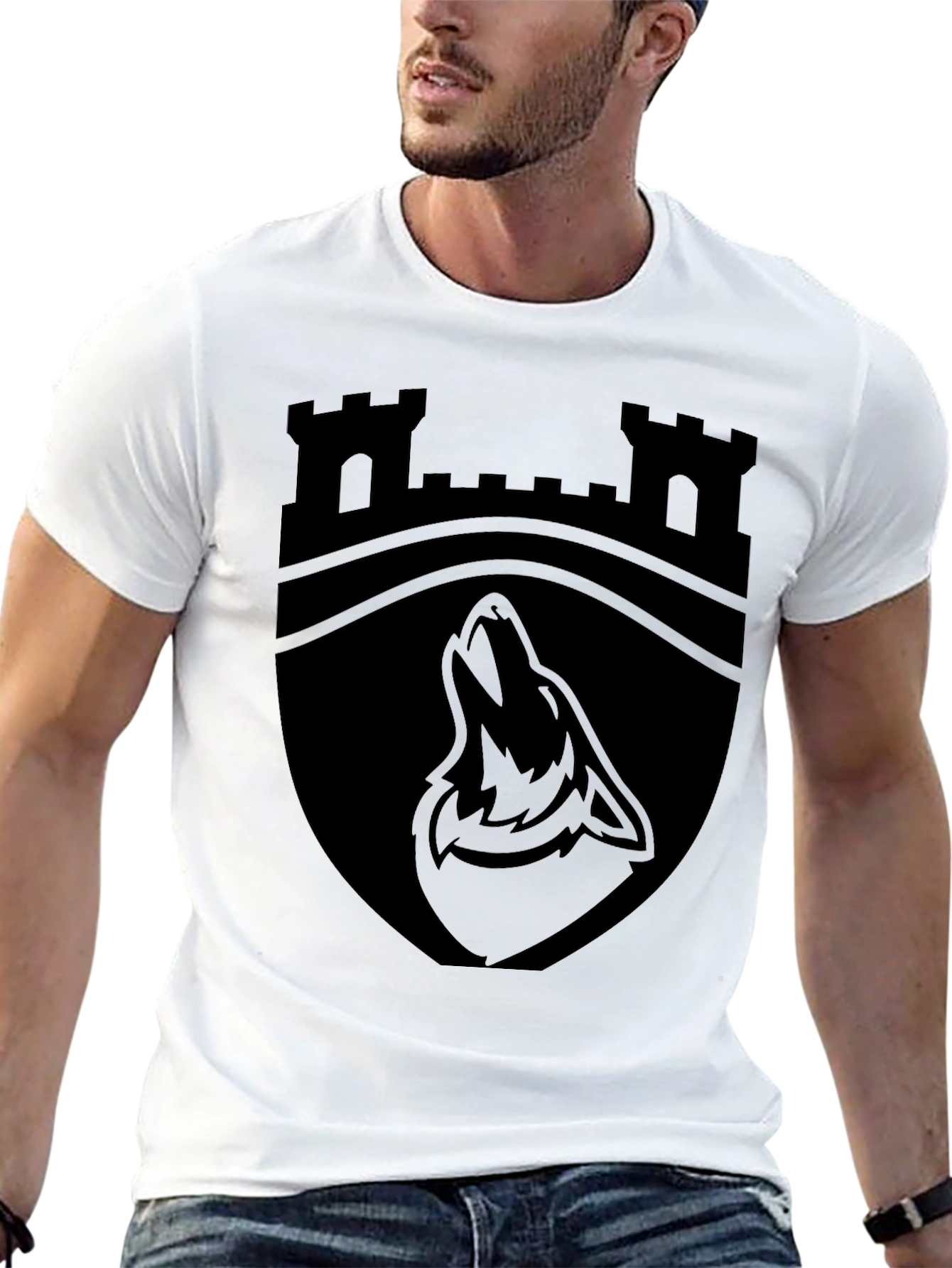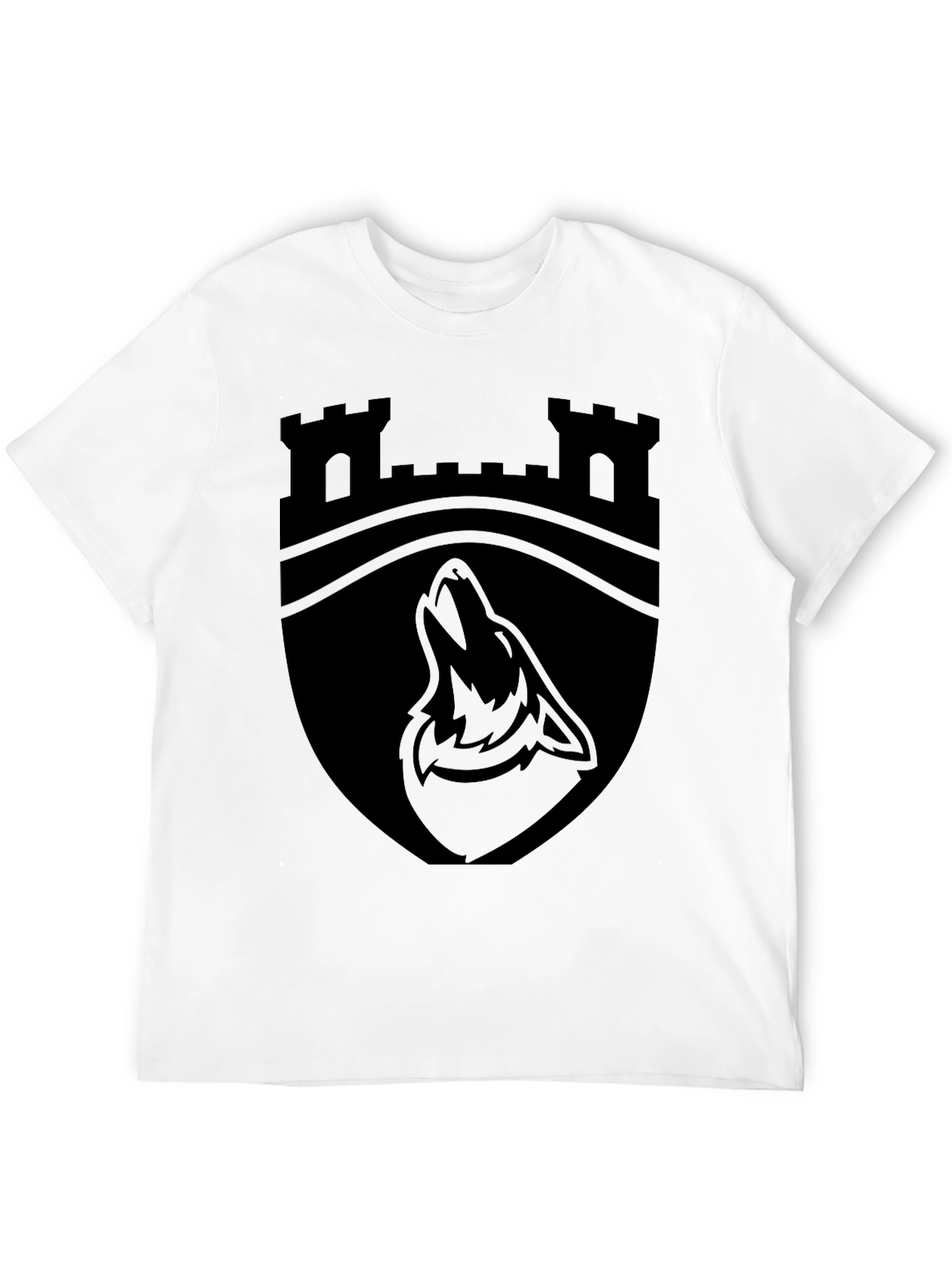 Embrace the mystique with this striking black t-shirt featuring a bold castle and wolf crest design. The graphic, rendered in a sleek black-on-black style, showcases a detailed castle silhouette above a stylized howling wolf, creating a powerful and eye-catching image. Perfect for casual wear, this tee is a subtle statement piece that expresses individuality and a love for unique designs. Made from a comfortable fabric, this t-shirt is ideal for everyday adventures, whether you're exploring the city or relaxing at home. A must-have for anyone seeking a blend of comfort and distinctive style.