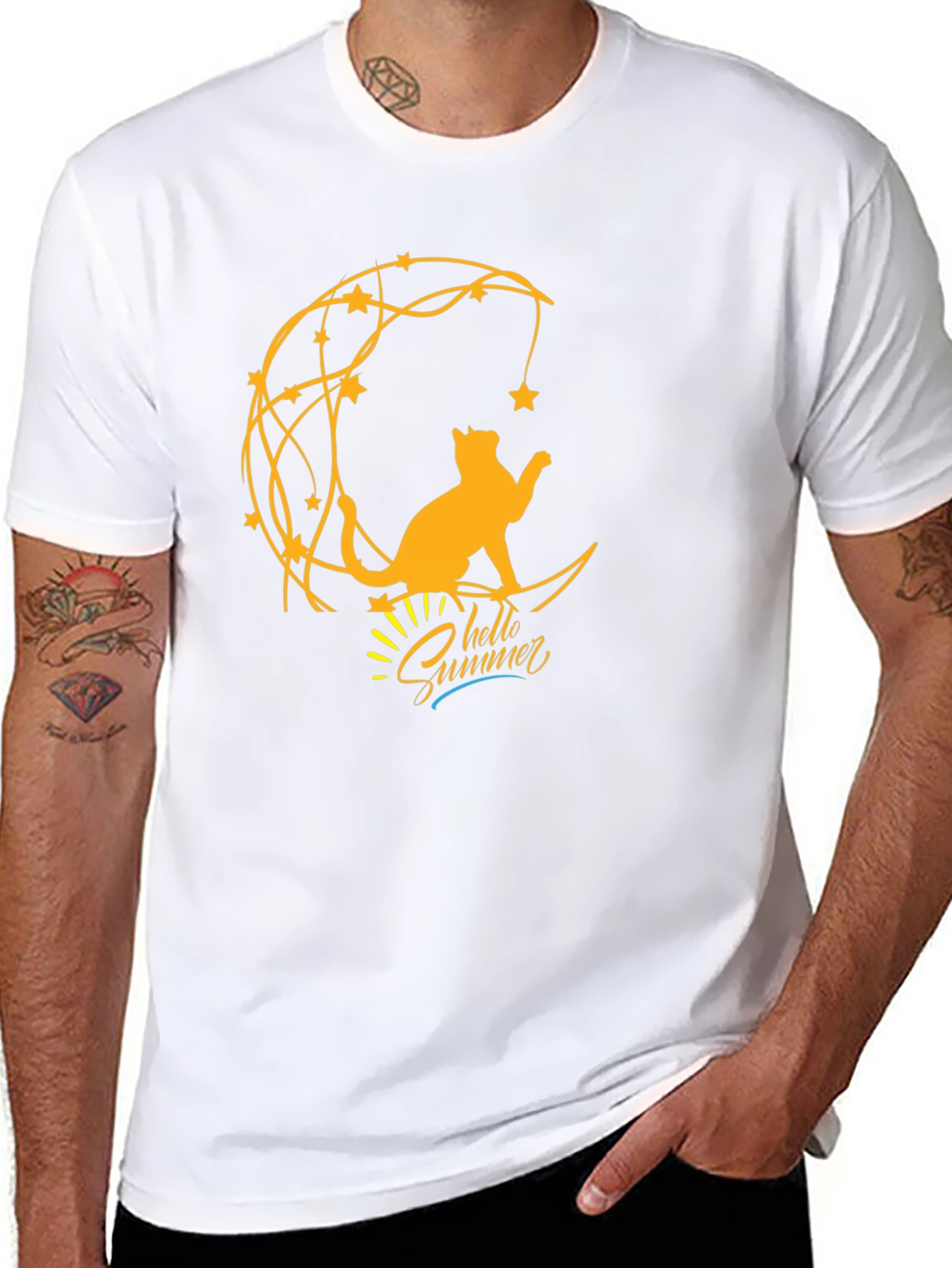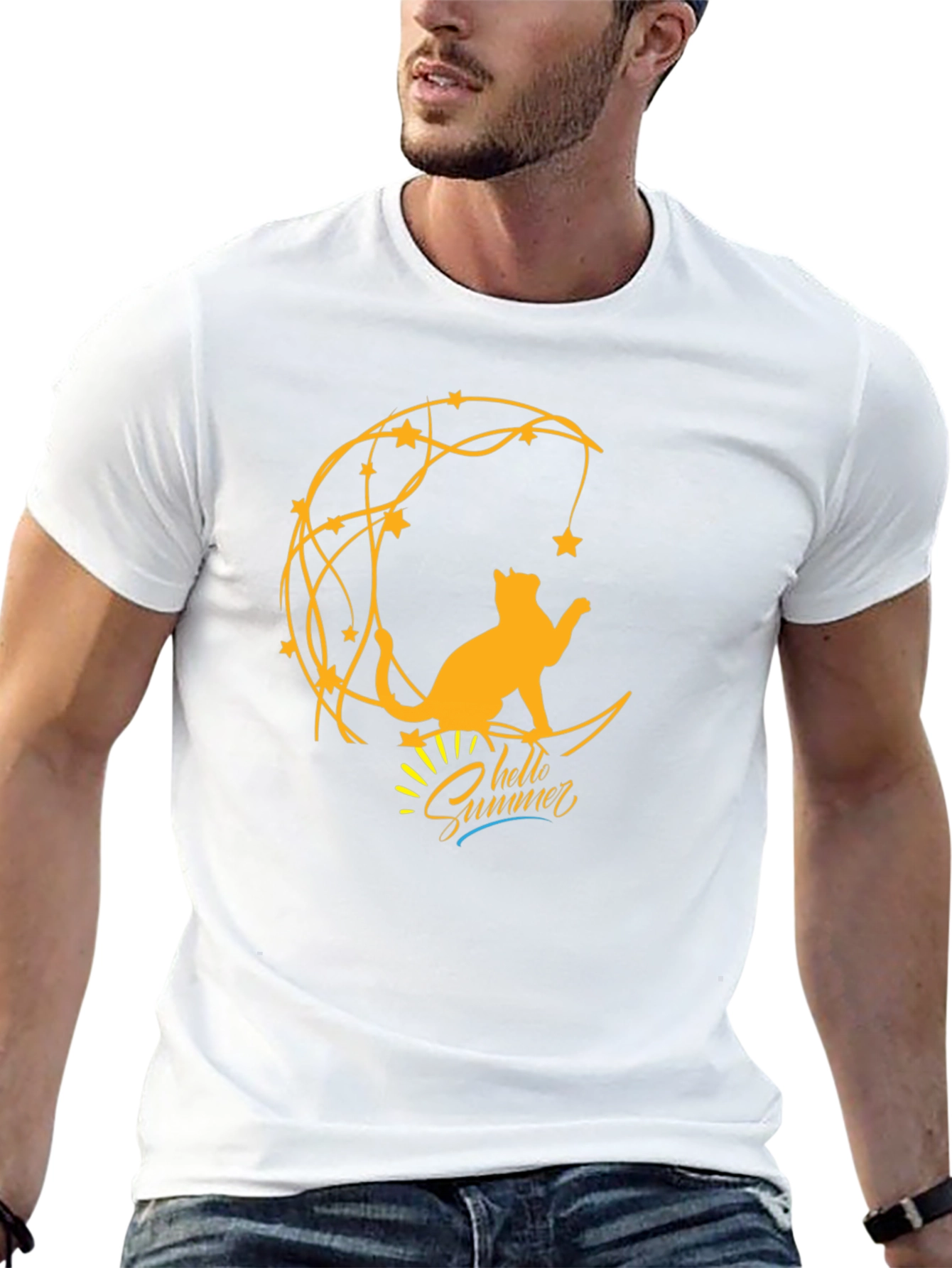 Embrace summer vibes with this stylish black T-shirt. Featuring a unique graphic of a cat sitting on a crescent moon, adorned with stars, it's perfect for cat lovers and summer enthusiasts. The 'Hello Summer' script adds a playful touch. Made from comfortable fabric, this tee is ideal for casual outings, relaxing at home, or adding a touch of whimsy to your everyday wardrobe. Show off your love for cats and summer with this eye-catching T-shirt!
