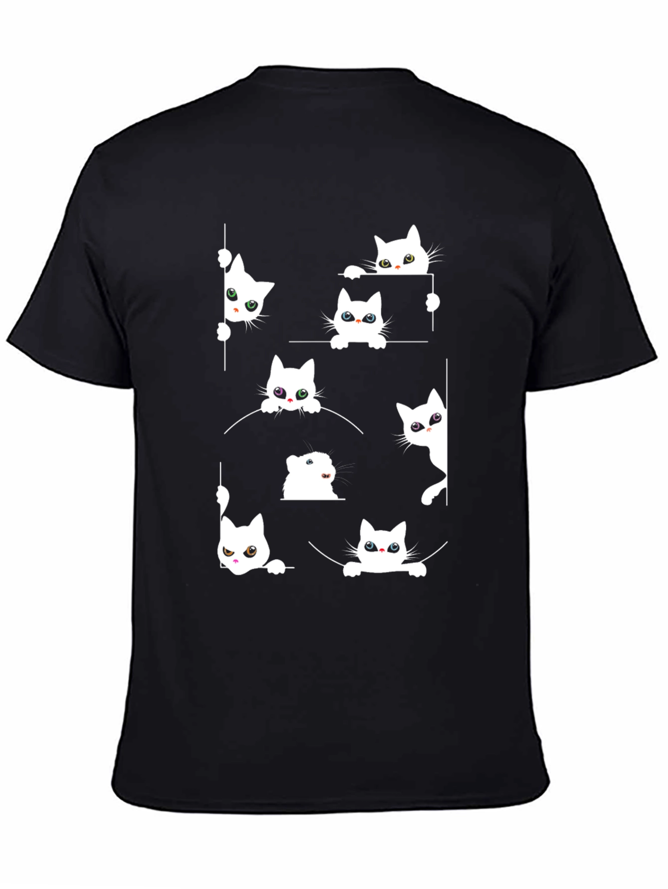 Show your love for felines with this playful cat peek-a-boo graphic tee! This black t-shirt features adorable cartoon cats peeking from behind lines and shapes. The design is printed in white, creating a striking contrast against the shirt's black background. Made from what appears to be a soft and comfortable fabric, this casual tee is perfect for everyday wear. Pair it with jeans or shorts for a fun and relaxed look. The whimsical design makes it a great gift for cat lovers of all ages. Get ready to turn heads and spark conversations with this unique and charming t-shirt!