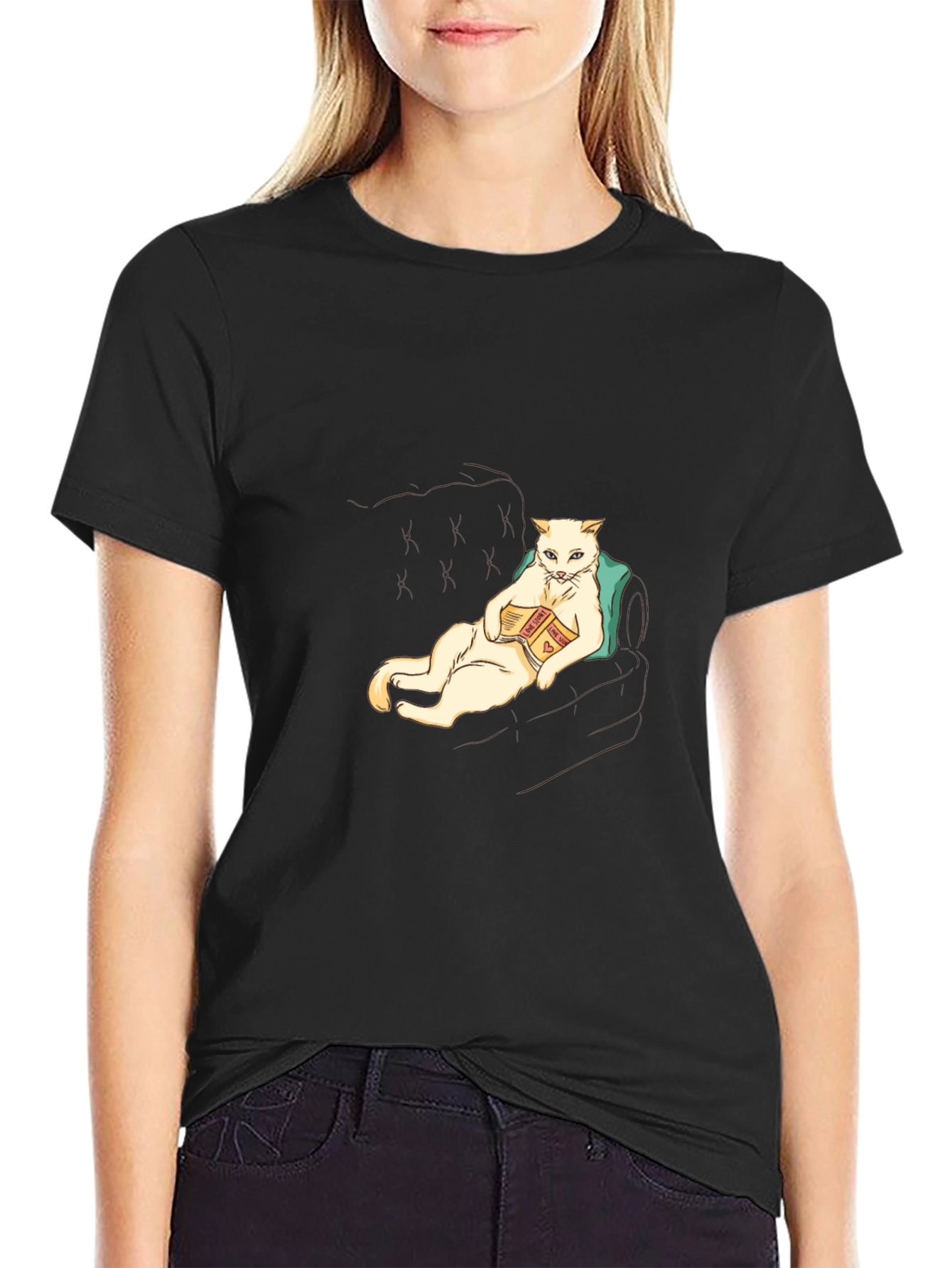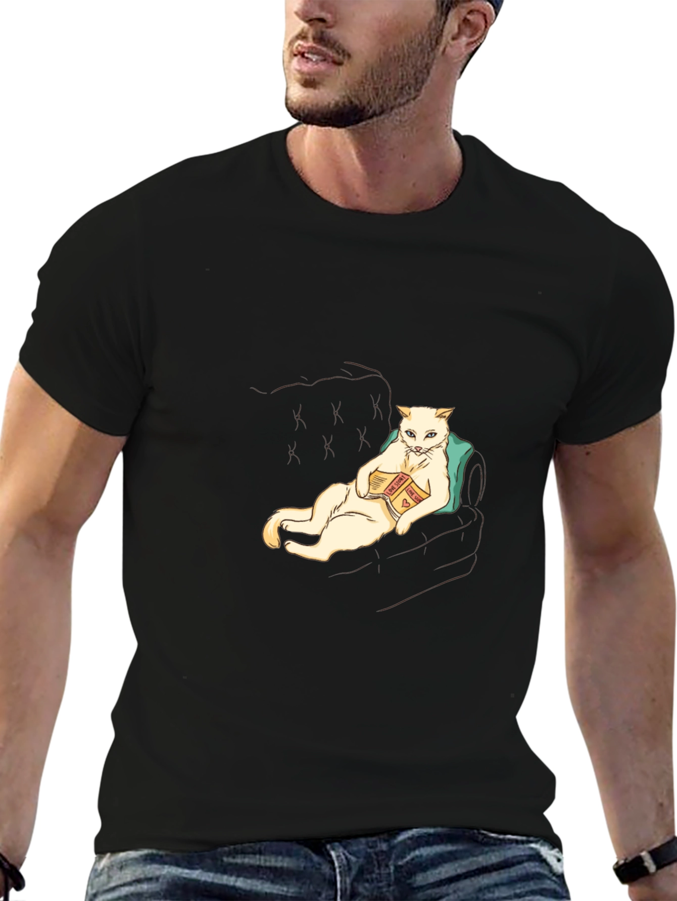This stylish black t-shirt features a unique graphic design of a cat comfortably reclining and engrossed in reading a book. The design adds a touch of whimsy and intellectual charm to your everyday style. Made from a comfortable fabric, this tee is perfect for casual outings, lounging at home, or making a statement with your individuality. Express your love for literature and feline friends with this eye-catching and conversation-starting t-shirt. Perfect for book lovers and cat enthusiasts alike, this is a must-have addition to your wardrobe.