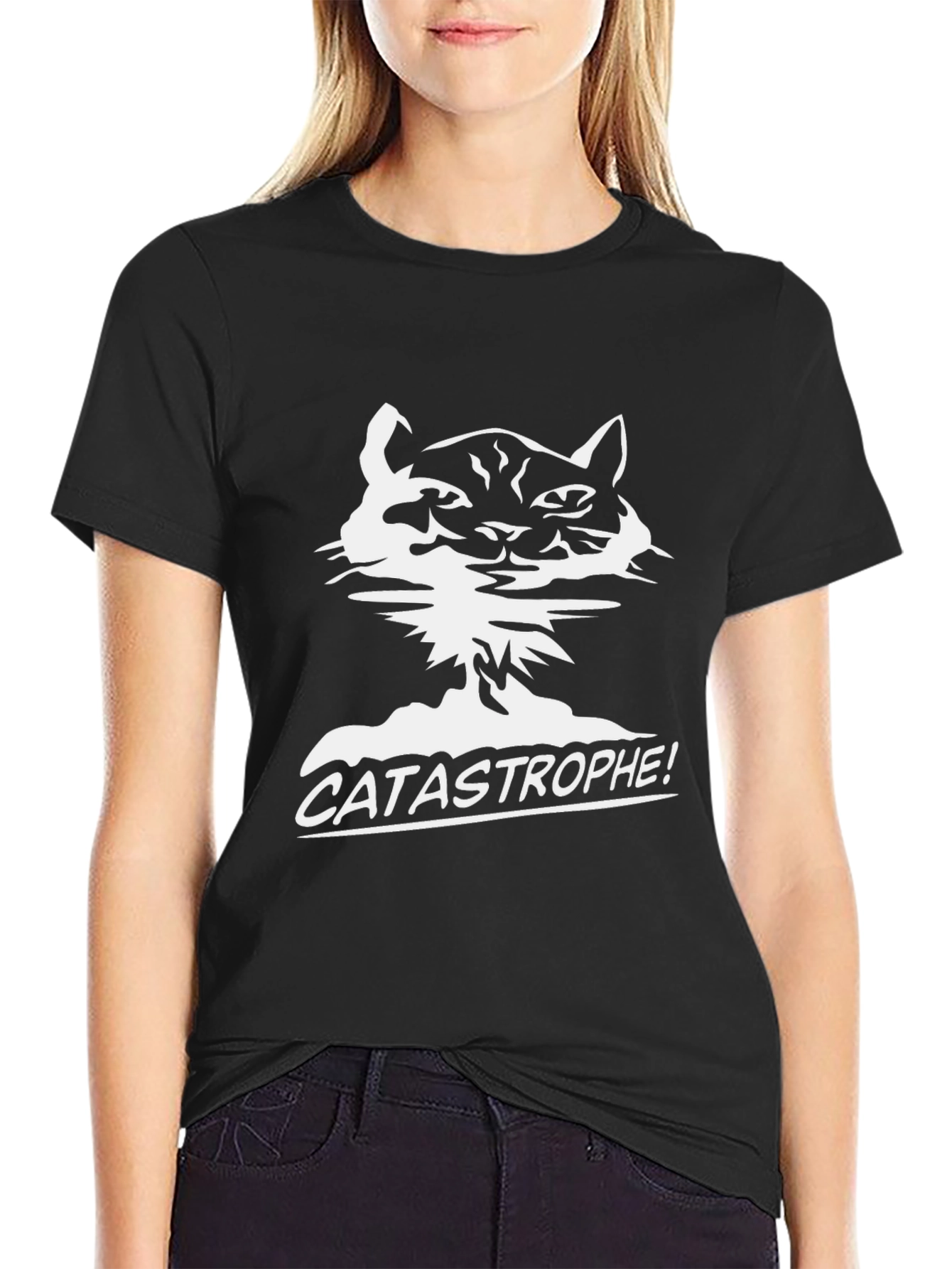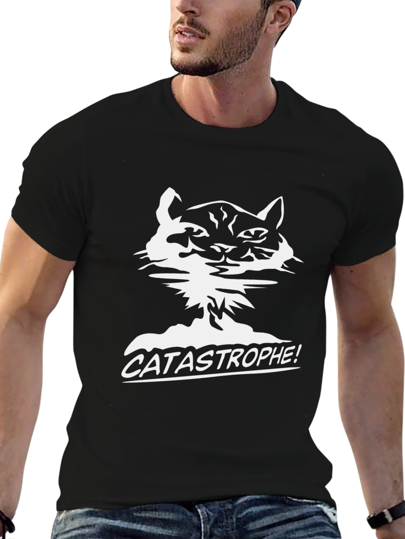 This black t-shirt features a unique graphic of a cat designed in a stylized white print. The graphic is paired with the bold word "CATASTROPHE!", adding a humorous touch. Made from a soft-looking fabric, this tee offers both style and comfort. Its classic fit makes it suitable for everyday wear, casual outings, or as a conversation starter at social gatherings. It is perfect for cat lovers with a sense of humor. The striking black and white design ensures it will pair well with jeans, shorts, or casual pants. Add this statement piece to your wardrobe!