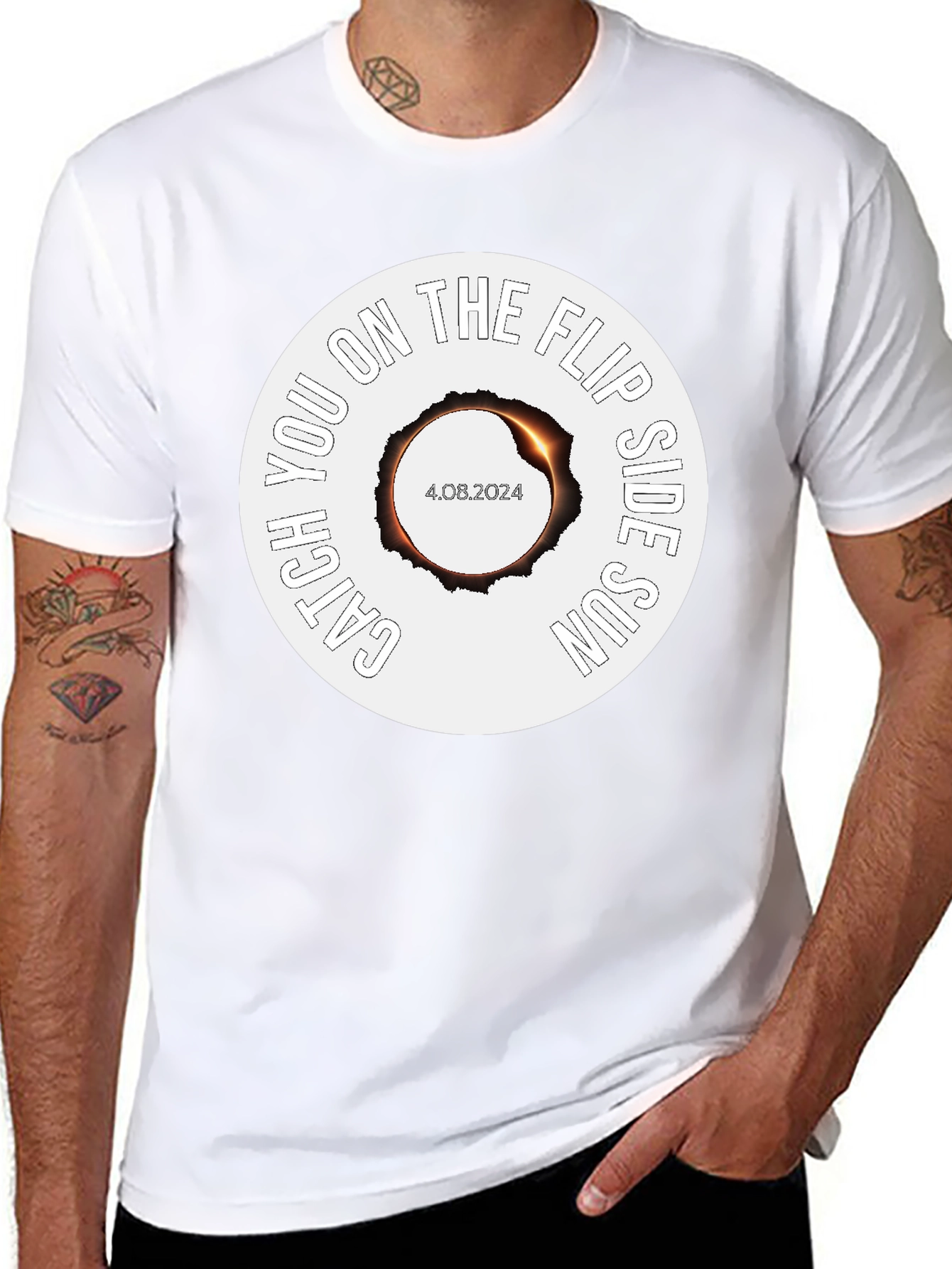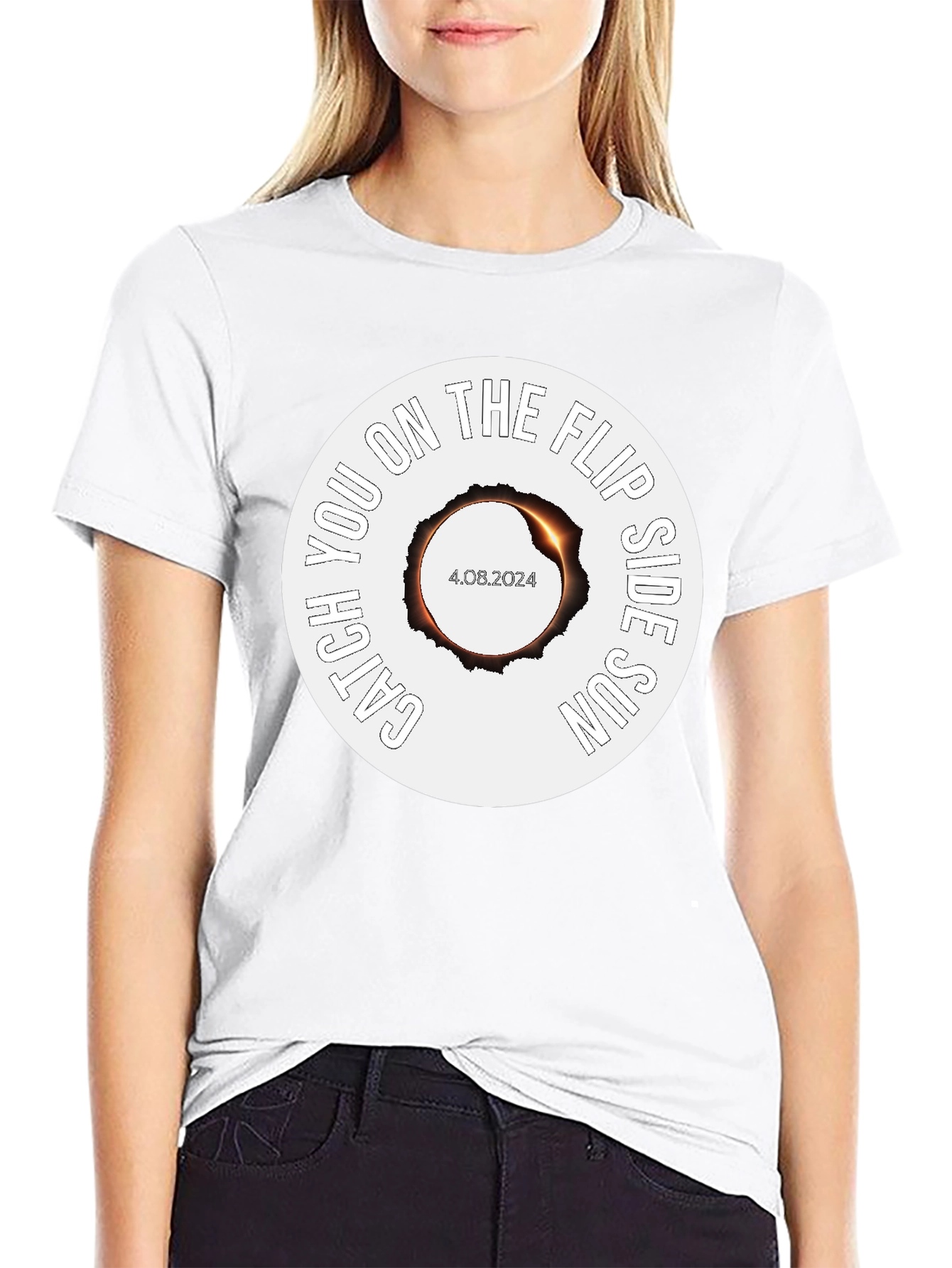 Witness the celestial event in style with this unique black t-shirt. It features a striking graphic of a solar eclipse with the date 4.08.2024 in the center. Encircling the eclipse is the phrase "Catch You on the Flip Side Sun". The design is printed on a soft, breathable fabric, perfect for all-day comfort whether you're an eclipse chaser or just love astronomy-themed apparel. This tee makes a great gift for science enthusiasts and anyone eager to commemorate the upcoming solar eclipse. A must have to celebrate this rare occasion.