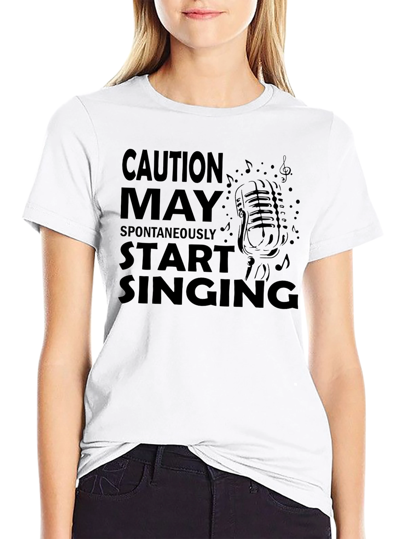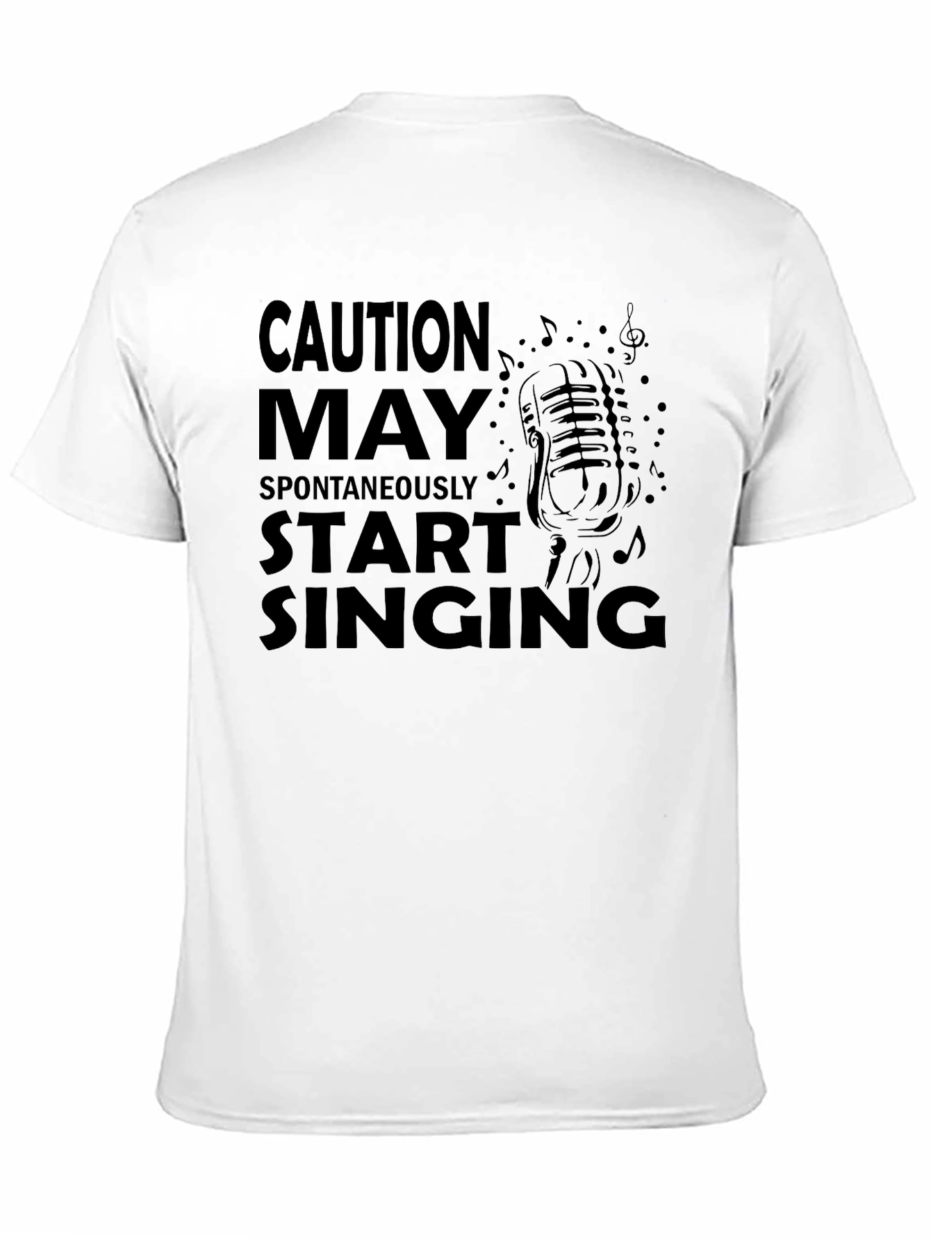 This classic black t-shirt features a humorous graphic print that reads "Caution May Spontaneously Start Singing," accompanied by a vintage-style microphone and musical notes. The design is perfect for music lovers, singers, or anyone with a fun sense of humor. Made from a soft-looking fabric, this tee offers comfort and style, ideal for casual wear, music events, or as a quirky gift. Its bold statement makes it a great conversation starter and a unique addition to any wardrobe. Show off your passion for music with this eye-catching and comfortable t-shirt.
