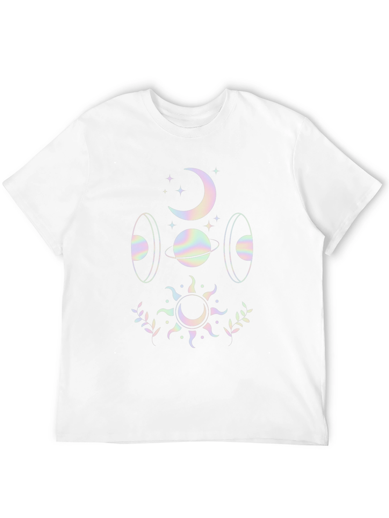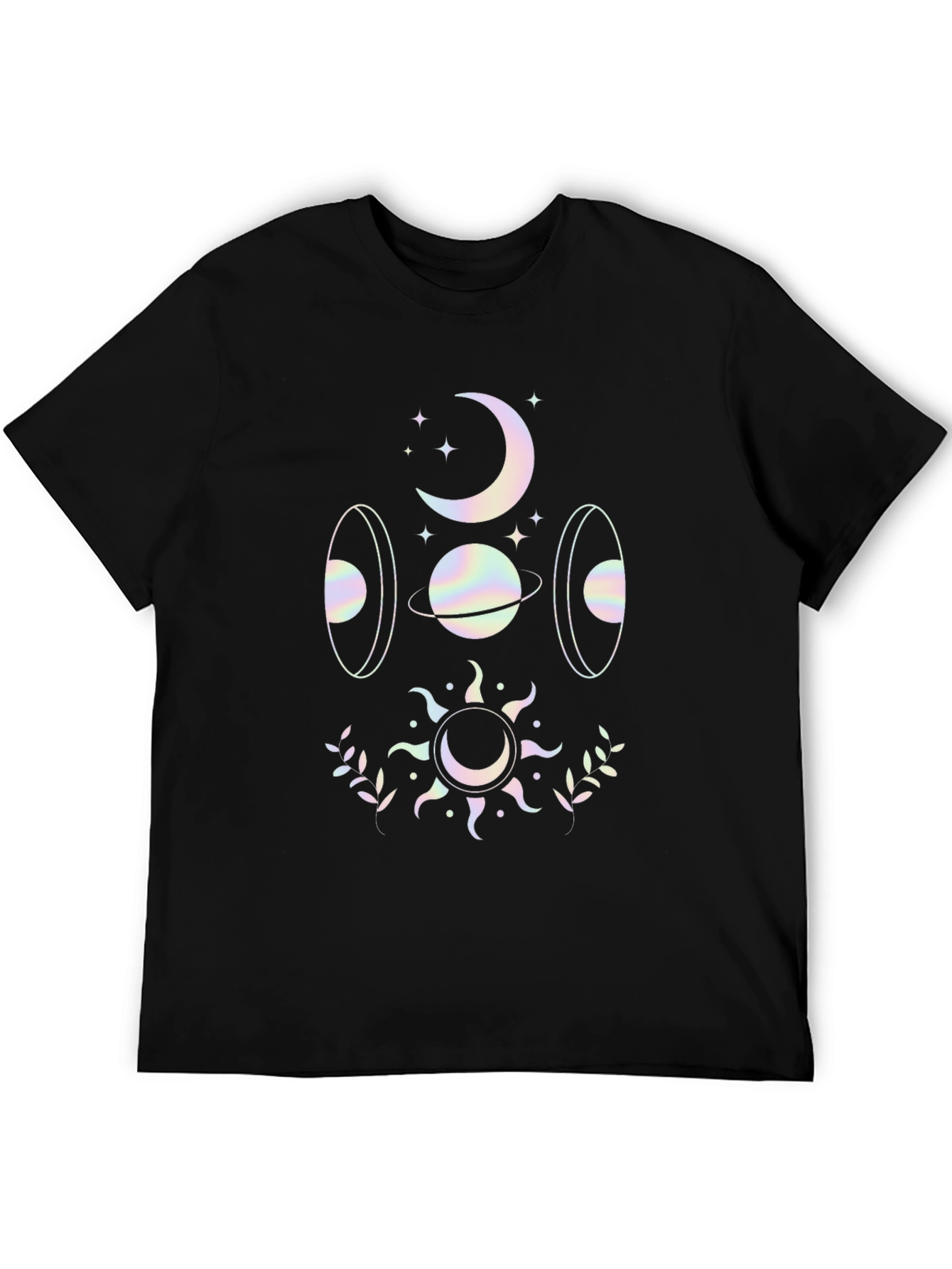 Embrace the cosmos with this stylish black t-shirt featuring a mesmerizing celestial design. The graphic showcases a moon, sun, and planets aligned in a unique arrangement, making it a standout piece for any wardrobe. Crafted from comfortable fabric, this tee is perfect for everyday wear. The eye-catching design adds a touch of cosmic charm, sure to spark conversation. Ideal for casual outings, layering under jackets, or showcasing your love for astronomy. Elevate your style with this versatile and trendy celestial graphic tee.