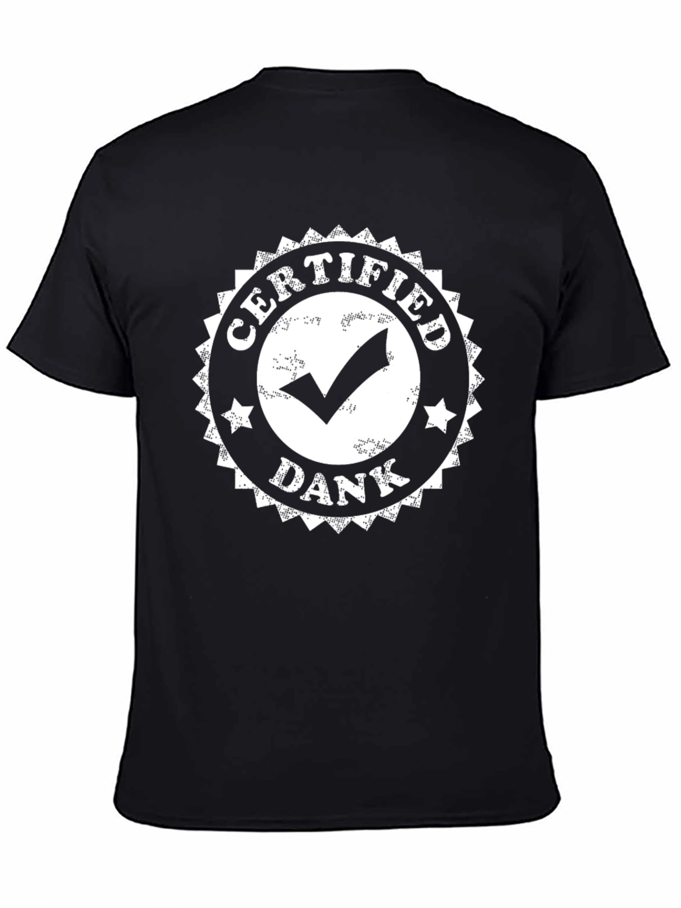 This classic black t-shirt features a bold, round white graphic with the text "CERTIFIED DANK" encircling a prominent check mark. The graphic also includes decorative stars, giving it a distinctive, edgy look. Made from what appears to be soft, breathable fabric, this tee offers both style and comfort. Perfect for casual wear, this shirt is ideal for expressing your unique sense of humor. Pair it with jeans, shorts, or your favorite streetwear for a standout look. The design is sure to spark conversation and turn heads wherever you go. This comfortable and stylish tee is a must-have addition to any wardrobe.
