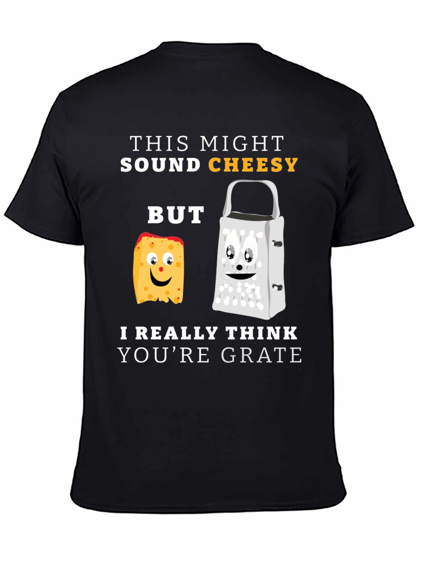 This black t-shirt features a humorous graphic that's sure to bring a smile. The design includes the text "This might sound cheesy, BUT" alongside cartoon images of a slice of cheese and a grater, followed by "I really think you're grate". The playful pun makes this shirt a fun and lighthearted choice for casual wear. Made from a comfortable-looking fabric, this tee is perfect for anyone who loves cheesy jokes and wants to showcase their sense of humor. Wear it to parties, casual outings, or just lounging at home for a chuckle.