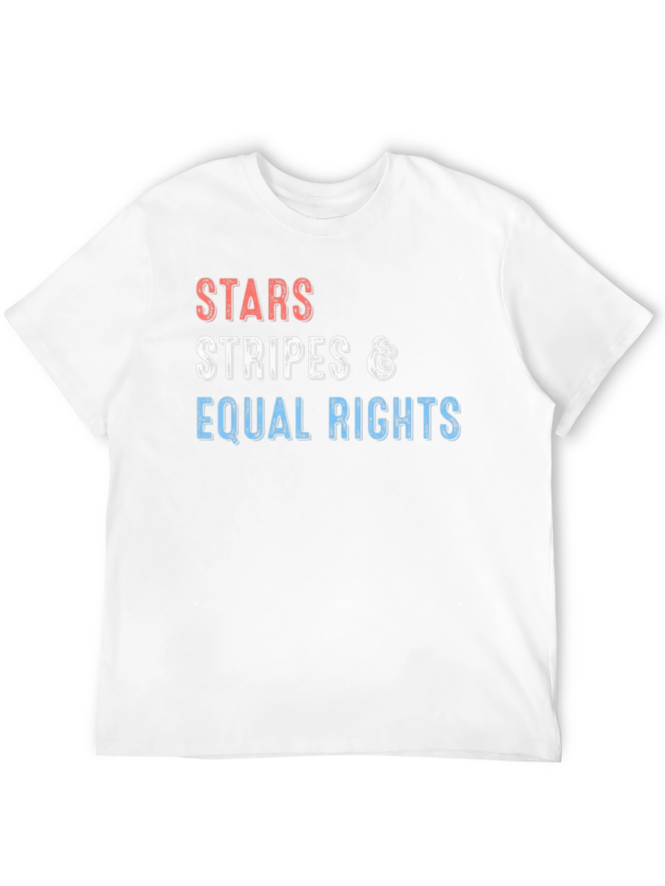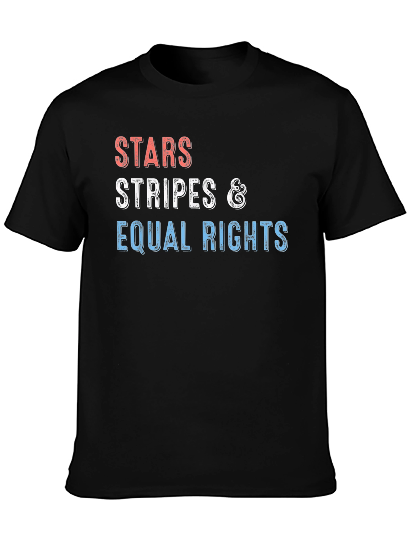 Show your patriotic spirit and commitment to equality with this stylish black graphic tee. The shirt features the words "Stars," "Stripes &," and "Equal Rights" printed in a stacked design, with "Stars" in red, "Stripes &" in white, and "Equal Rights" in blue. Made from comfortable fabric, this t-shirt is perfect for casual wear, Fourth of July celebrations, or any occasion where you want to express your values. Make a statement and spread a message of inclusivity with this unique and eye-catching tee.