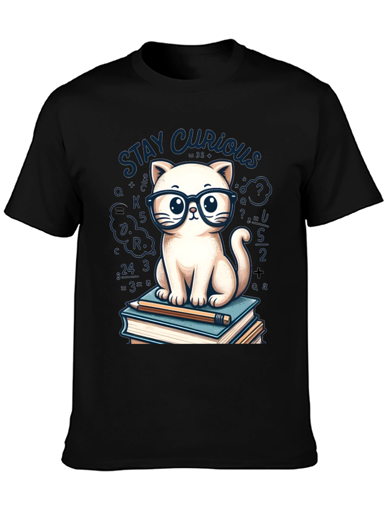 Show off your love for knowledge with this adorable black t-shirt featuring a curious cat design. The graphic showcases a cute white cat wearing glasses, sitting atop a stack of books with a pencil. The design is complete with the phrase "Stay Curious" and math-related doodles, perfect for students, teachers, or anyone who loves learning. Made from a soft, comfortable fabric, this tee is ideal for everyday wear. It's a fun and unique way to express your intellectual side and makes a great gift for the bookworm in your life. Get yours today and stay curious!