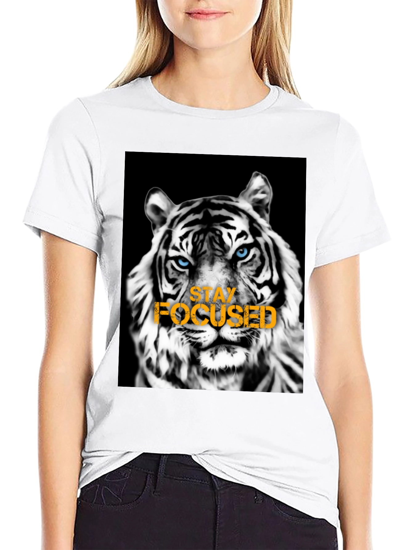 Unleash your inner strength with this striking black graphic tee. Featuring a captivating monochrome tiger design with piercing blue eyes, overlaid with the motivational message 'Stay Focused' in bold orange letters, this shirt is more than just apparel – it's a statement. Crafted from a comfortable, breathable fabric, it's perfect for everyday wear, workouts, or casual outings. Stand out from the crowd and showcase your determination with this unique and stylish tee. Ideal for those who appreciate bold designs and motivational messages, this tee is a must-have addition to your wardrobe.