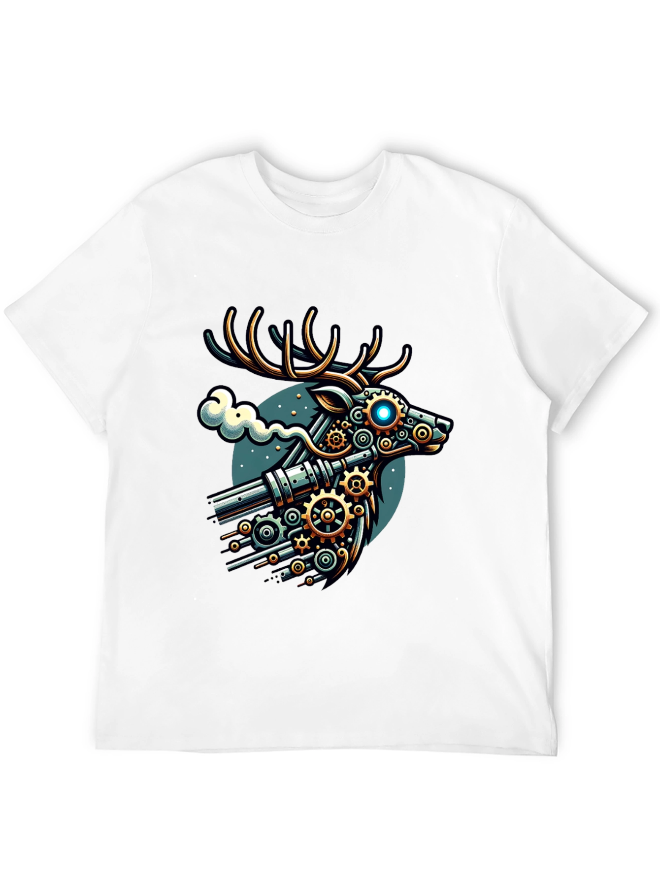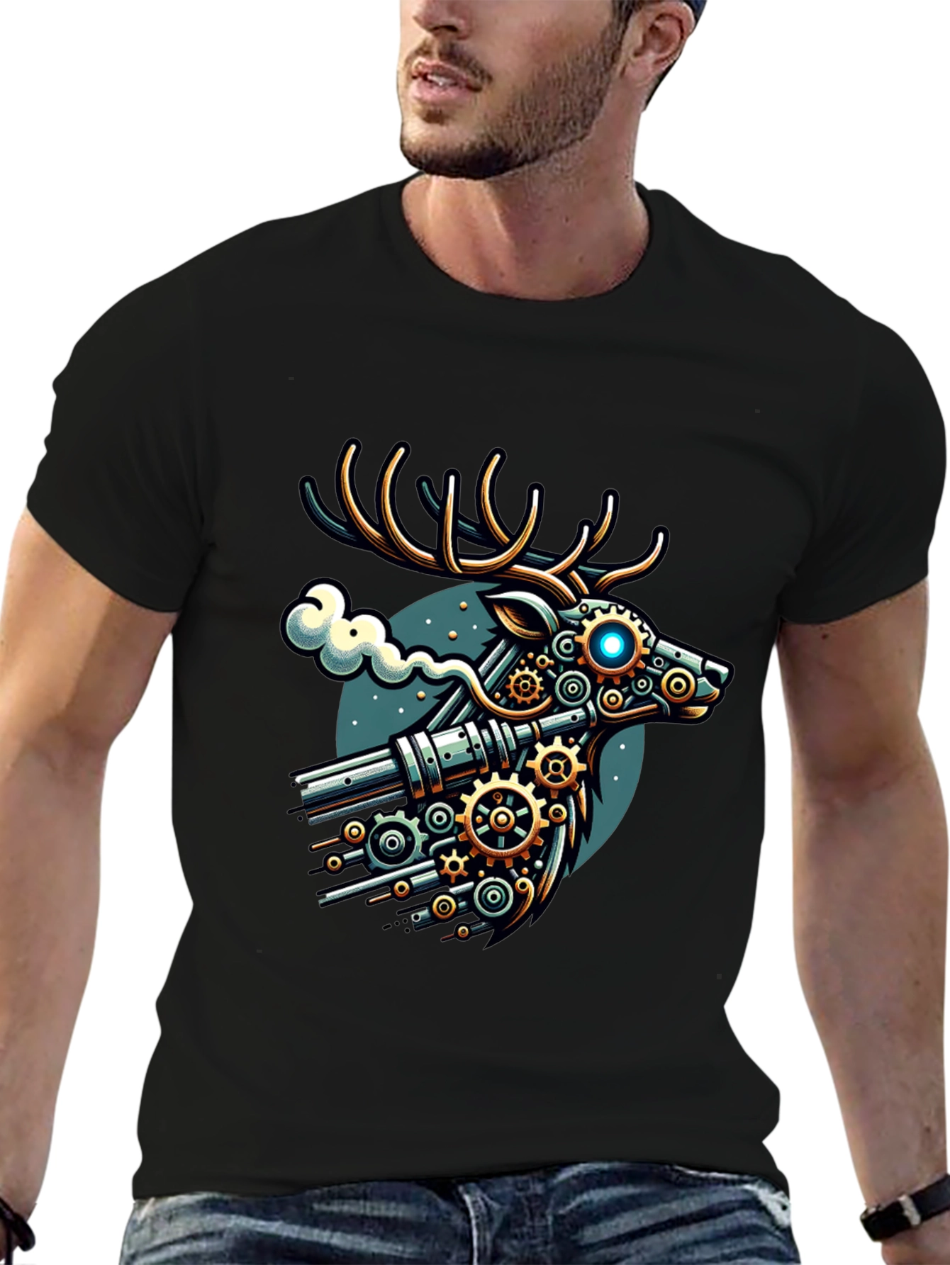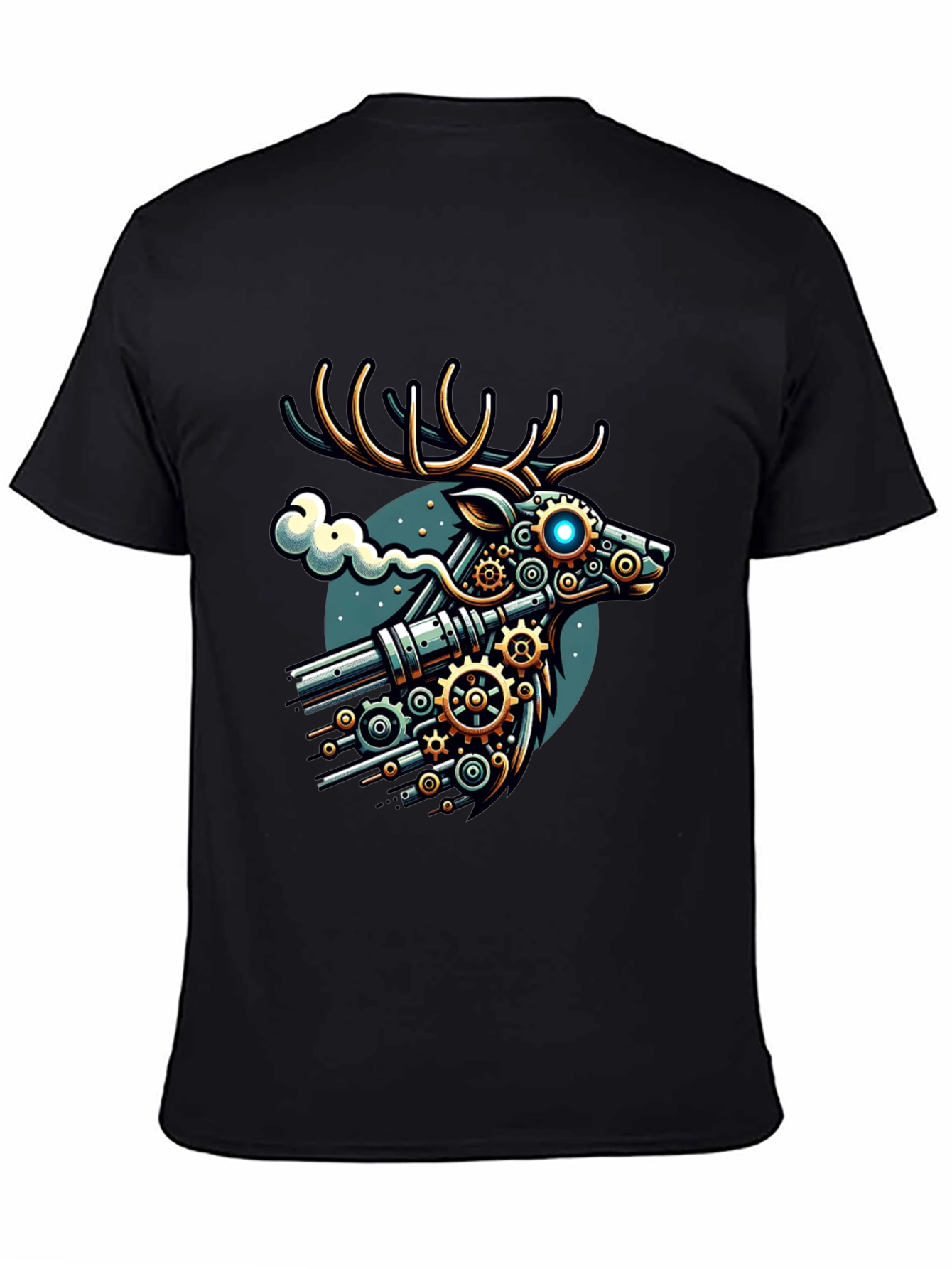 Stand out with this unique black t-shirt featuring a striking steampunk deer graphic. The design showcases a deer head rendered with intricate gears, pipes, and metallic details, complete with glowing blue eyes. Against a teal backdrop with a hint of vapor, this tee is perfect for making a statement. Ideal for casual wear, concerts, or conventions, it's a must-have for steampunk enthusiasts and anyone looking for a distinctive piece. Add this conversation starter to your wardrobe today!