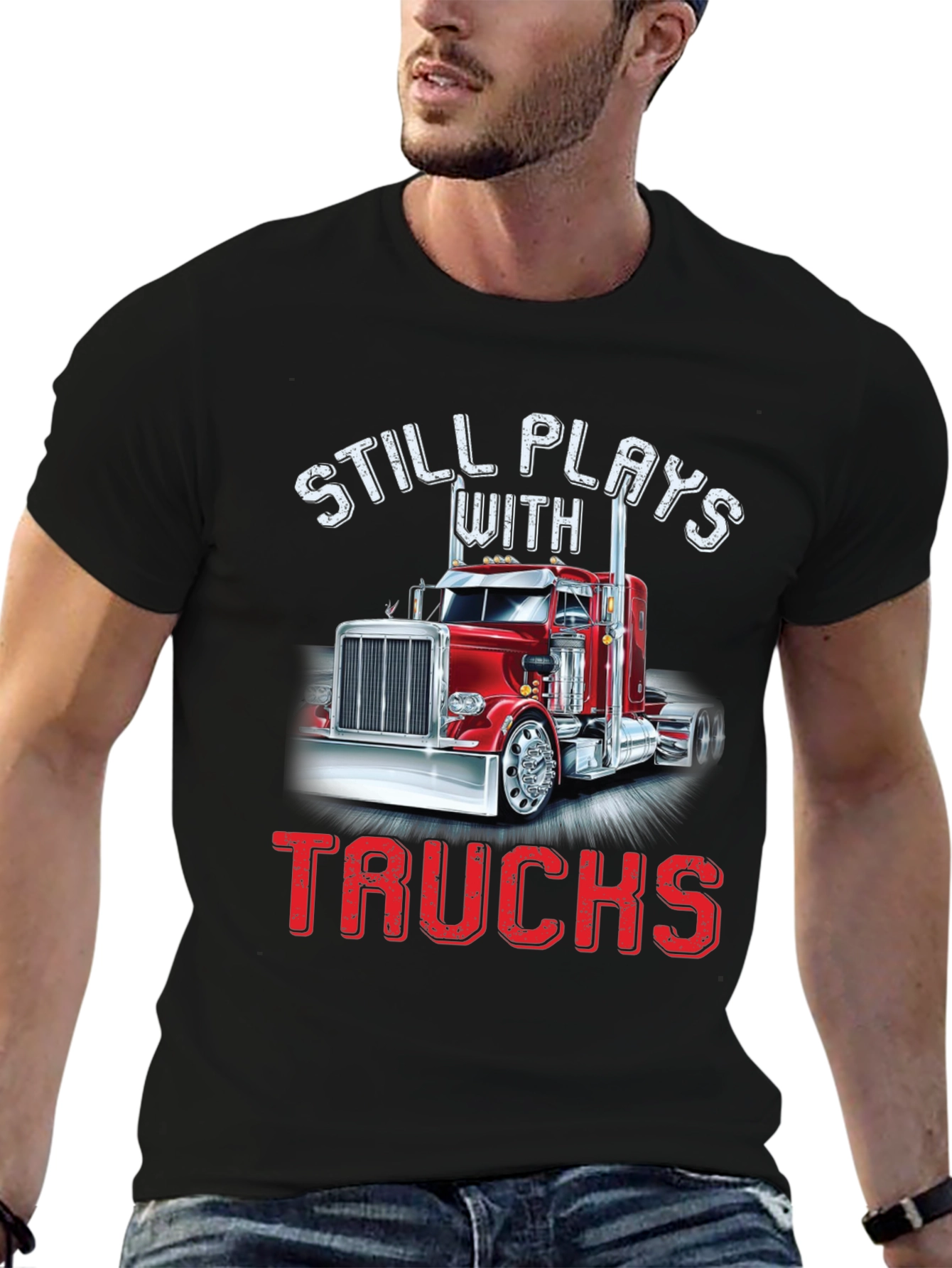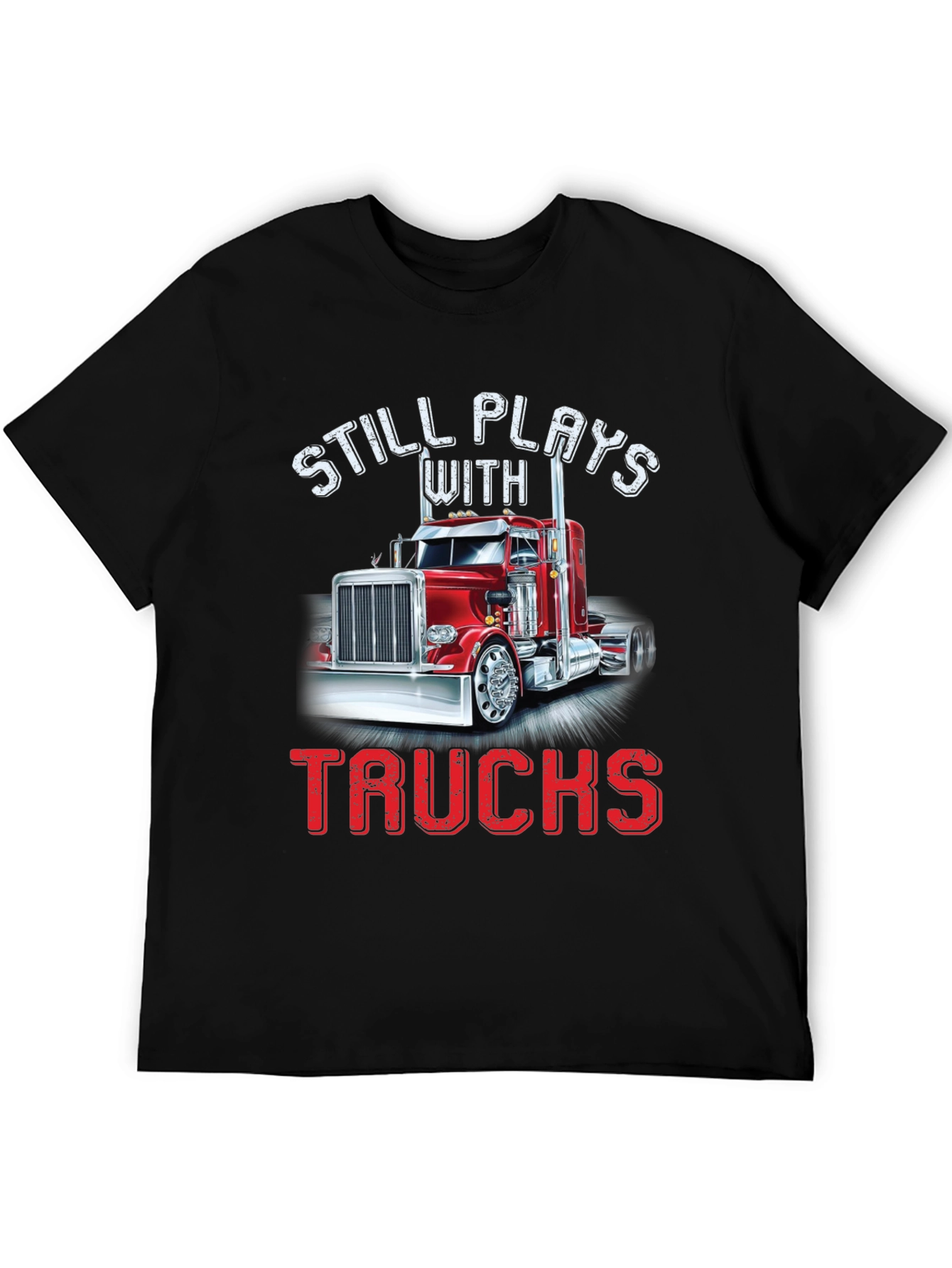 Show off your love for trucks with this stylish black T-shirt. Featuring a vibrant graphic of a red semi-truck, playfully framed by the text "STILL PLAYS WITH TRUCKS" in bold lettering. The design adds a touch of humor and nostalgia. Made from comfortable fabric, this tee is perfect for casual wear, trucking events, or as a fun gift for the truck enthusiast in your life. Grab yours now and let everyone know that some passions never fade!