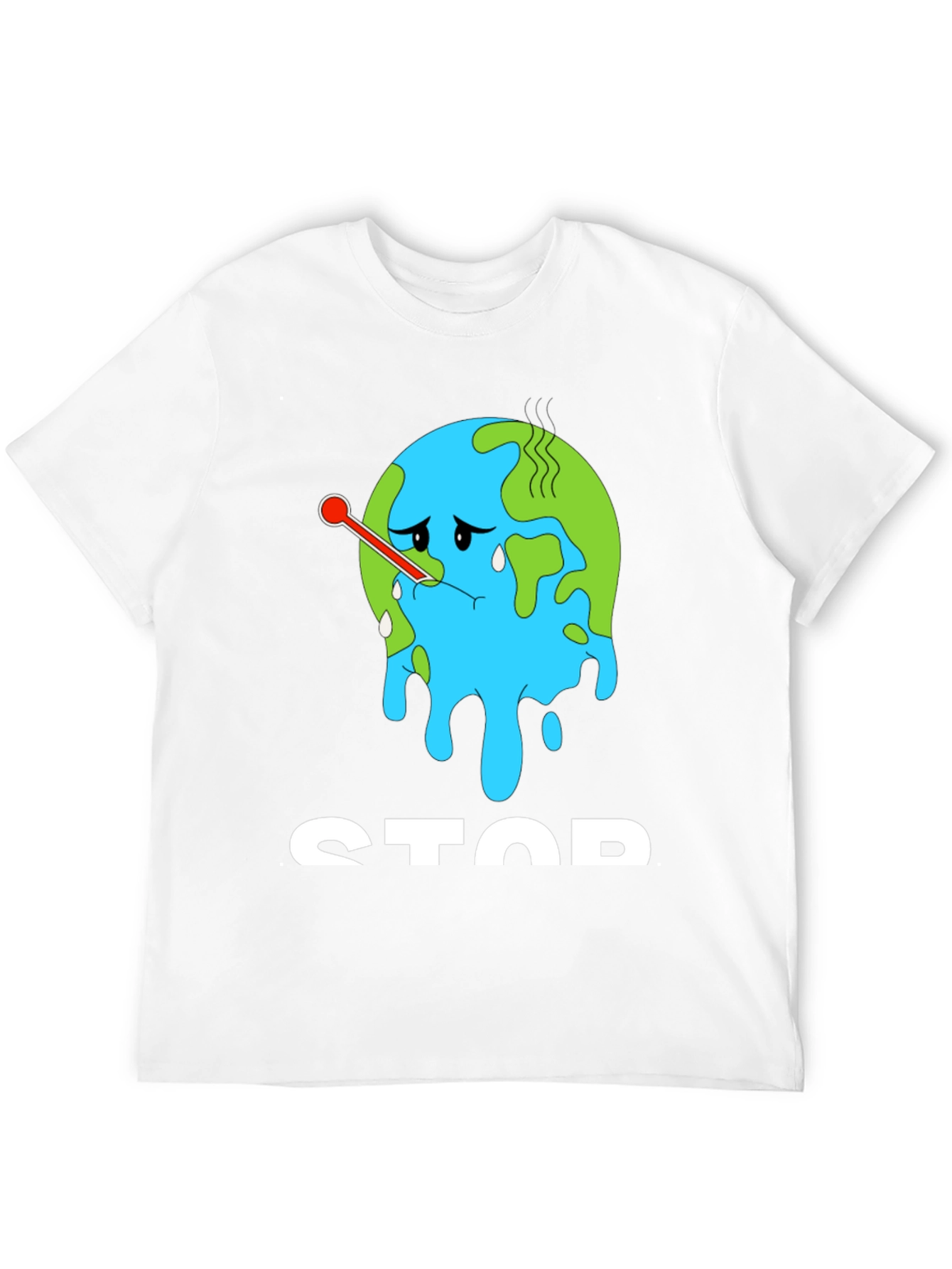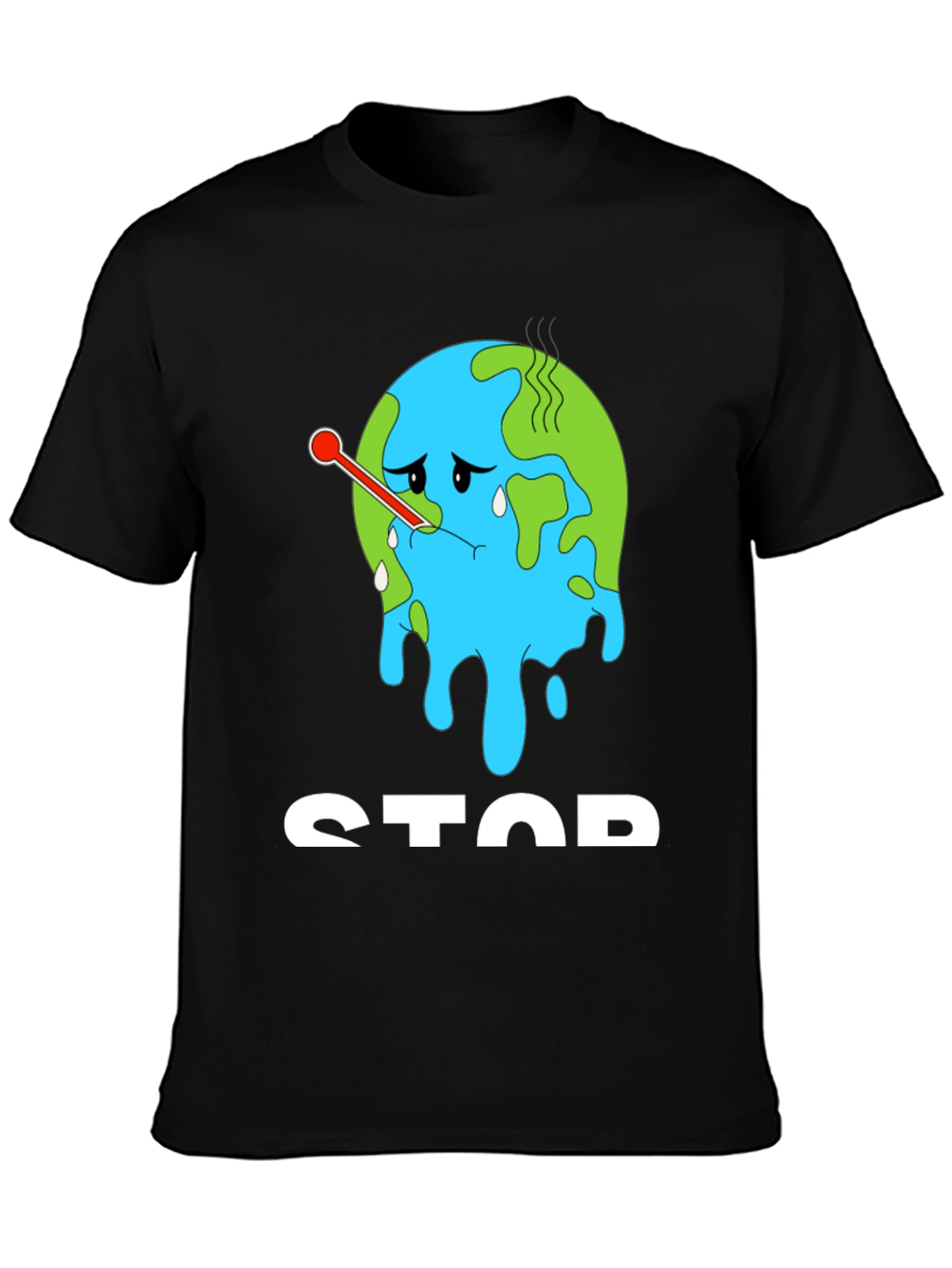 Show your concern for our planet with this impactful graphic tee! This black t-shirt features a poignant image of the Earth with a thermometer, showing it melting, a visual reminder of climate change. Made from a comfortable-looking fabric, this short-sleeved shirt is perfect for everyday wear. The design is eye-catching and sure to spark conversations. Wear it to climate rallies, educational events, or just as a daily reminder to be eco-conscious. Let's spread awareness and inspire change with this powerful "Stop Global Warming" t-shirt!